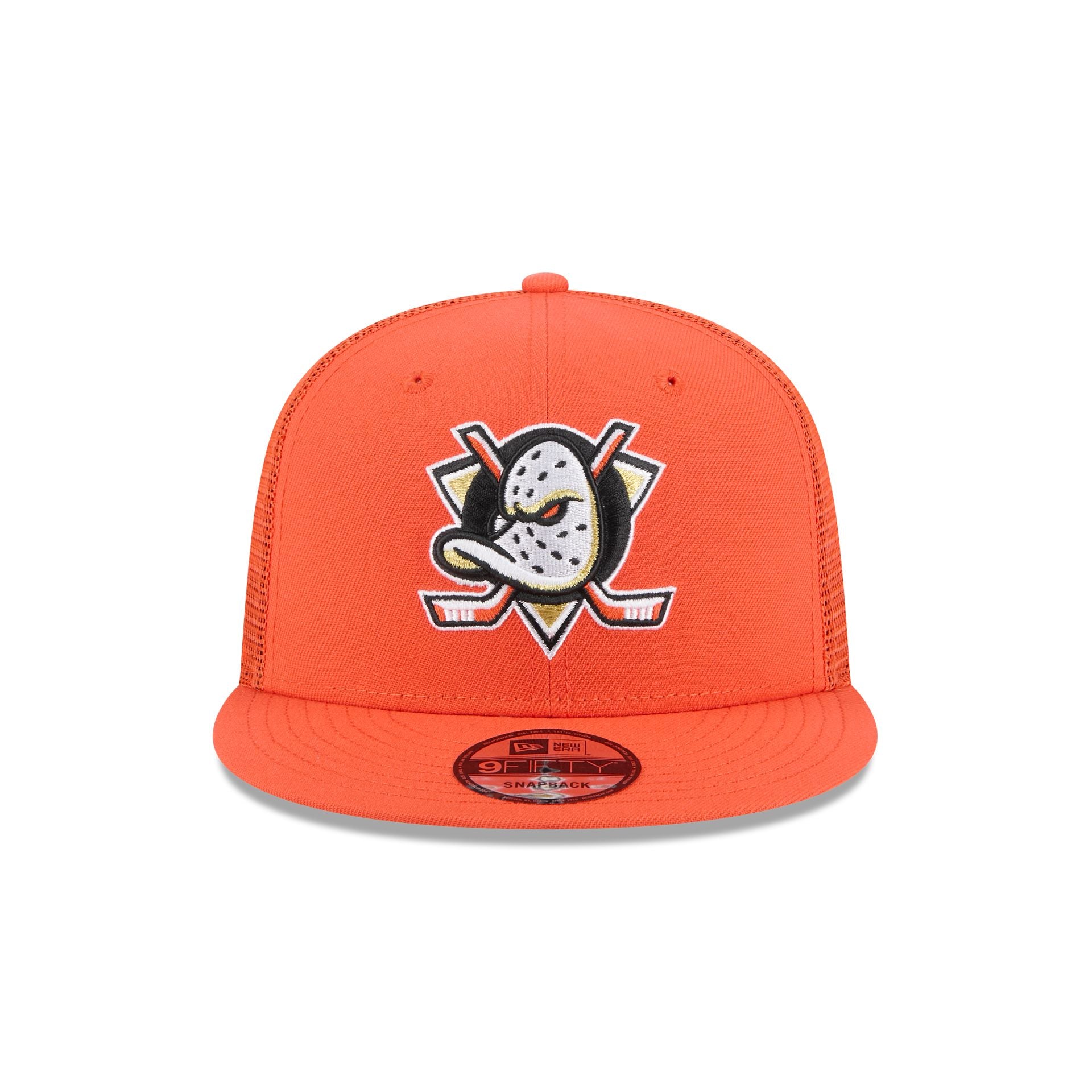 The Anaheim Ducks Team Tag 9FIFTY Trucker features an embroidered Ducks logo at the front panels with a team tag on an snapback closure at a mesh rear and a gray undervisor.