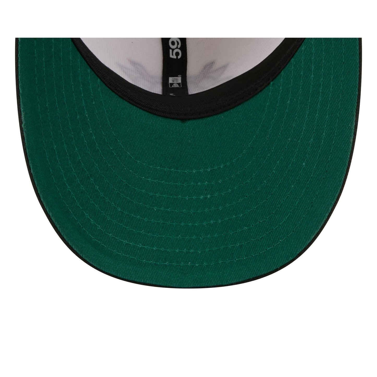 The Anaheim Ducks Tonal Florals White Pre-Curved 59FIFTY Fitted Cap features an embroidered Ducks logo at the front panels with a team color visor and a green undervisor. Additional details include chainstitched embroidered flowers with handstitched beading at the left-wear side and a matching NHL Shield at the rear.