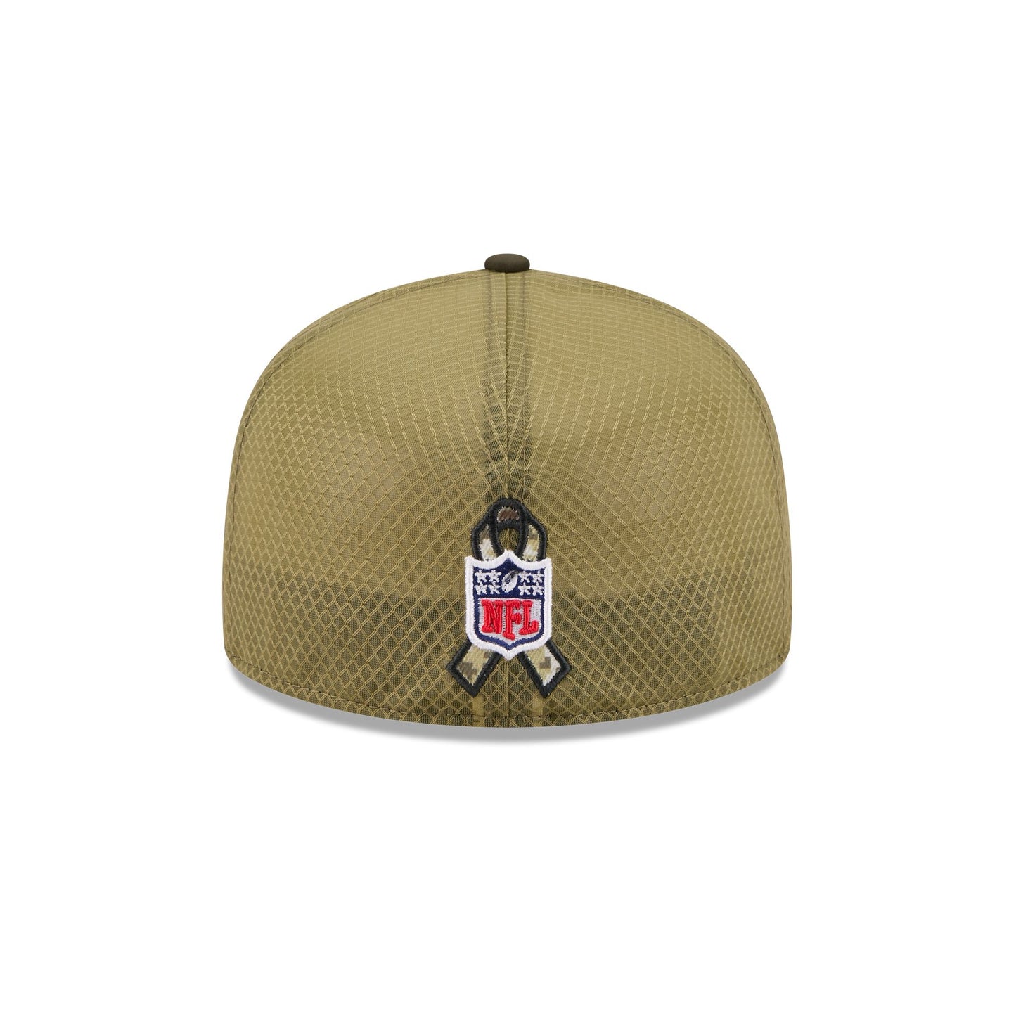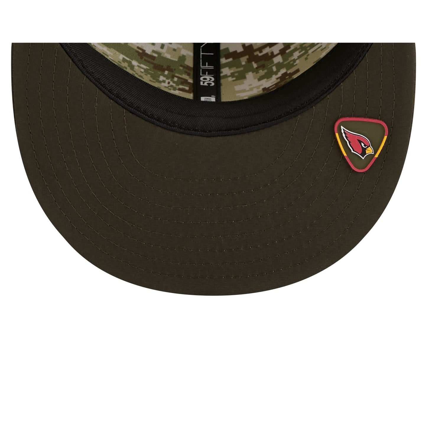 The Arizona Cardinals 2025 Salute to Service 59FIFTY Fitted Cap features an embroidered Cardinals logo at the front panels with the official NFL Salute to Service patch at the rear mesh panels. Additional details include an American flag patch at the right-wear side with a silicone team logo patch at a dark green undervisor and a digi camo interior fabrication.