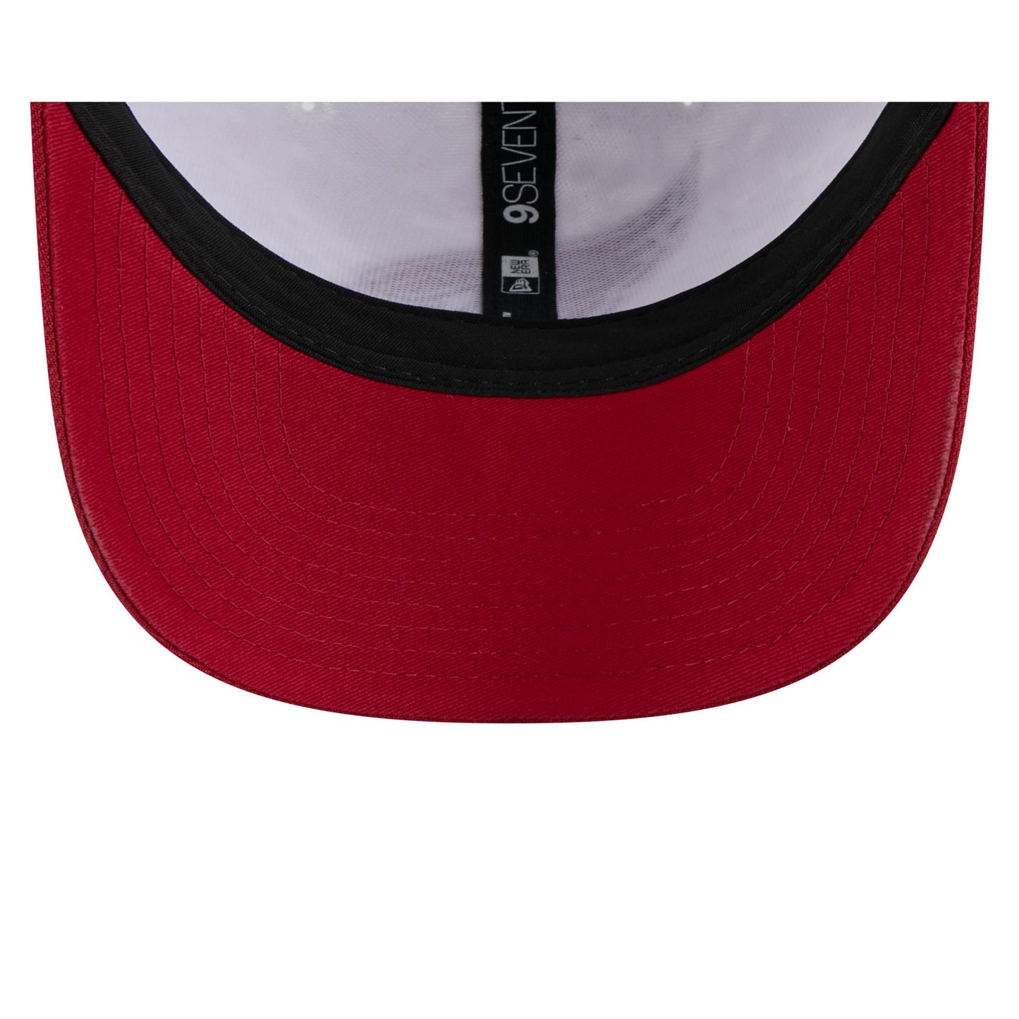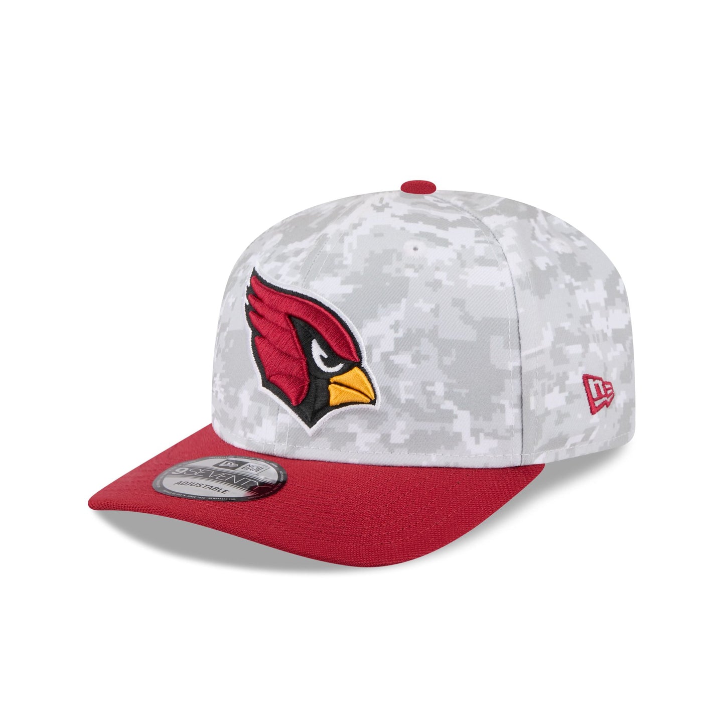The Arizona Cardinals 2025 Salute to Service Fan Gear 9SEVENTY Stretch-Snap Cap features an embroidered Cardinals logo at the front panels with the official NFL Salute to Service patch above a snapback closure at the rear, an American flag patch at the right-wear side, and a team color visor.