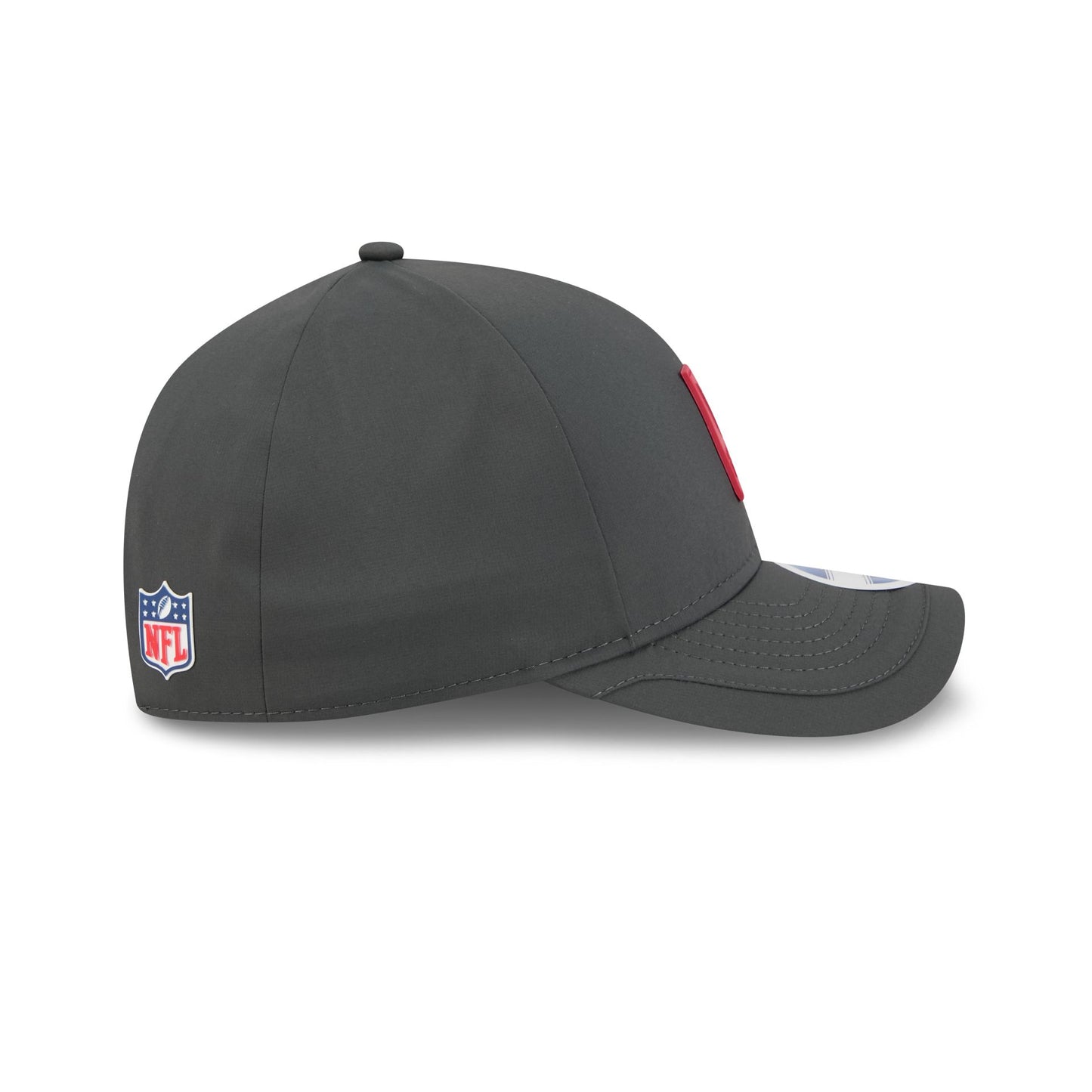 The Arizona Cardinals 2025 Sideline Cold Weather Steel Clouds 9FORTY M-Crown Snapback features a sewn-down silicone Cardinals logo patch at the front panels with a water-repellent quill tech fabrication throughout and a quick-dry cushioned sweatband to absorb moisture. Additional details include the Official NFL Shield logo to the right of a soft silicone snapback closure at the rear. The crown has bonded seams to trap warmth and the undervisor is accented with a silicone transfer in the team’s colors.