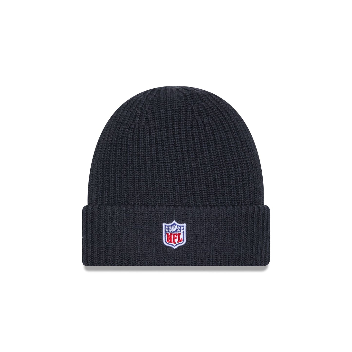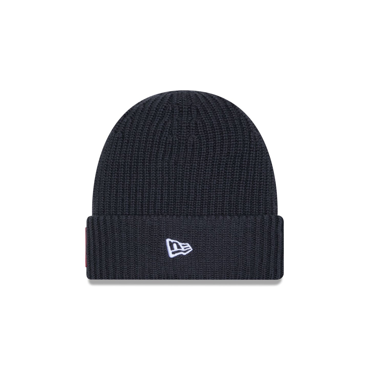 The Arizona Cardinals 2025 Sideline Cold Weather Steel Clouds Cuff Knit Beanie features a sewn-down silicone Cardinals logo patch at the front cuff with a matching Official NFL Shield logo at the rear. The beanie is knit from wool yarn and lined with fleece.