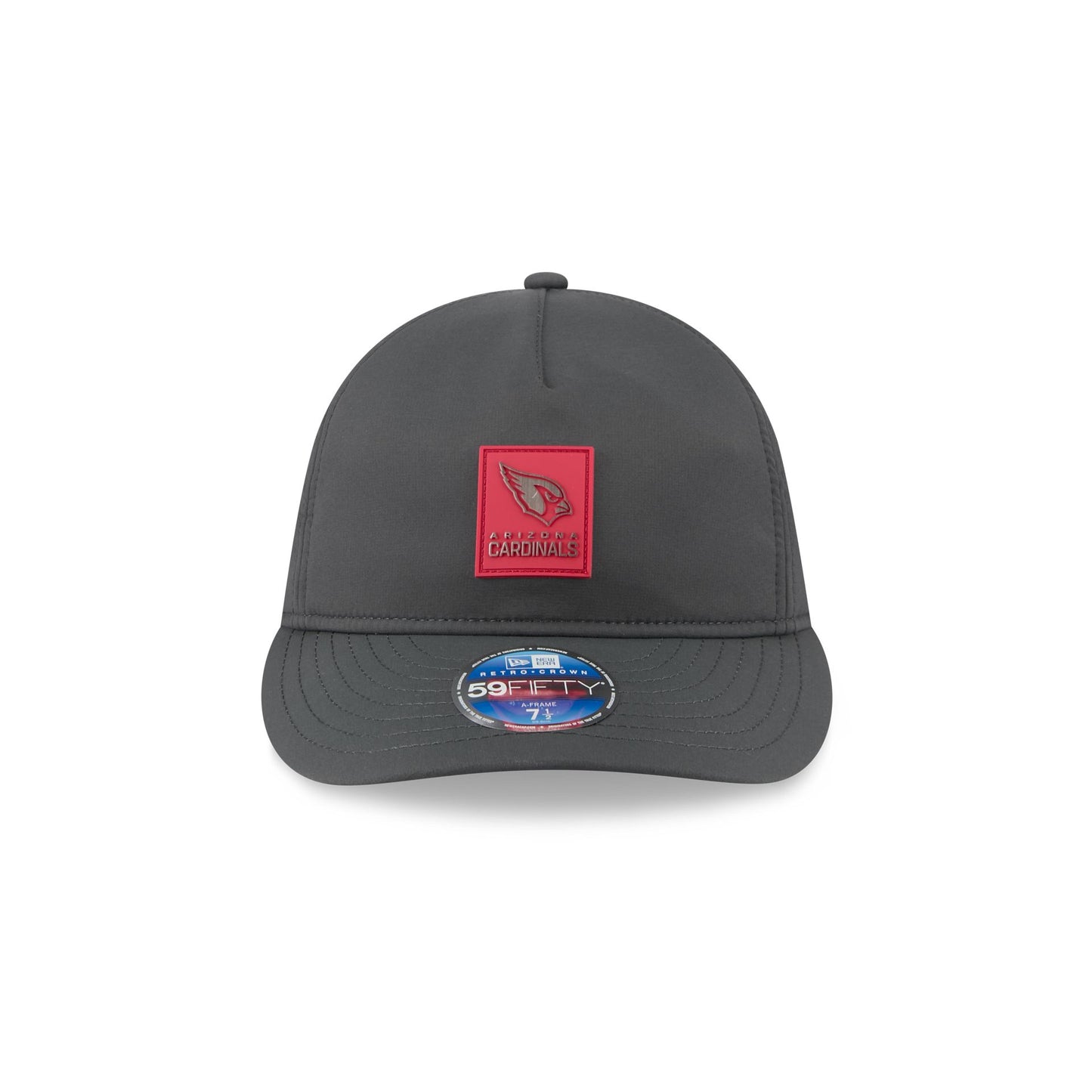 The Arizona Cardinals 2025 Sideline Cold Weather Steel Clouds Retro Crown 59FIFTY A-Frame Fitted Cap features a sewn-down silicone Cardinals logo patch at the front panels with the Official NFL Shield logo at the rear. The cap has a water-repellent quill tech fabrication throughout, with an insulated crown and quick-dry cushioned sweatband. The undervisor is accented with a silicone transfer in the team’s colors.