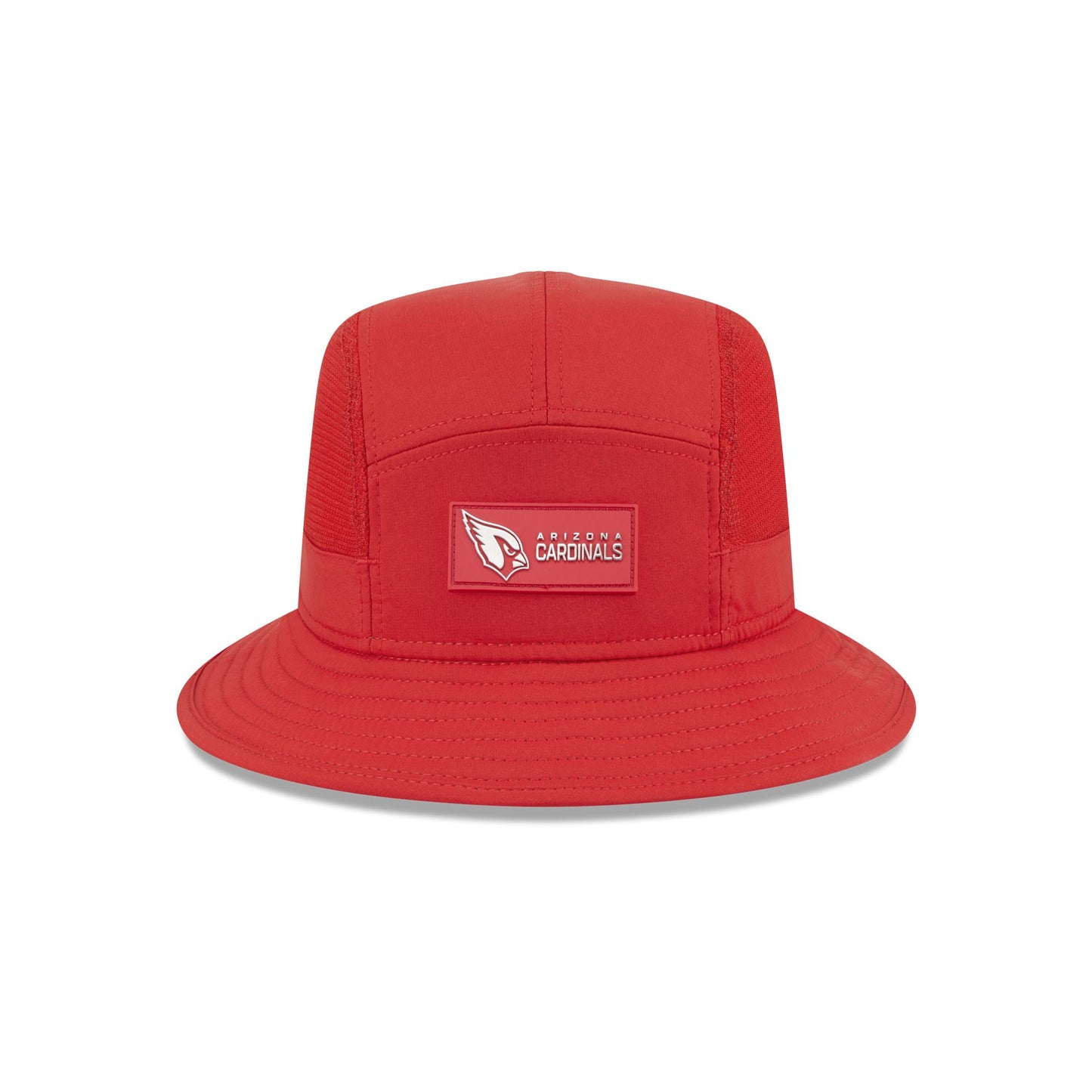 The Arizona Cardinals 2025 Sideline Hot Weather Bucket Hat features a sewn-down silicone Cardinals logo patch at the front with the Official NFL Shield logo at the right-wear side. Additional details include breathable mesh side panels and an adjustable reflective drawstring at the rear.