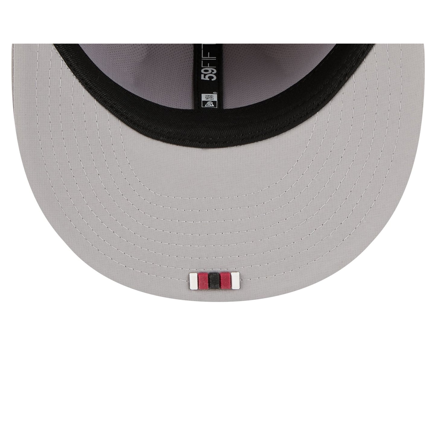 The Arizona Cardinals 2025 Sideline Hot Weather Gray 59FIFTY Fitted Cap features a sewn-down silicone Cardinals logo patch at the front panels with a matching Official NFL Shield logo at the rear. The cap has a water-repellent quill tech fabrication throughout, with a quick-dry cushioned sweatband to absorb moisture. The undervisor is accented with a silicone transfer in the team’s colors.
