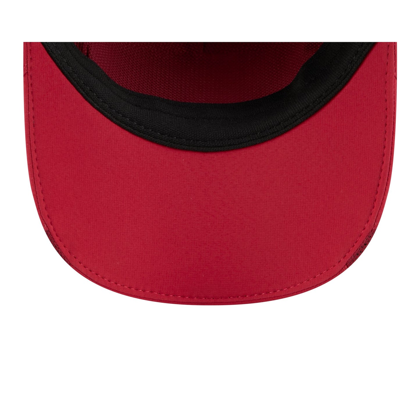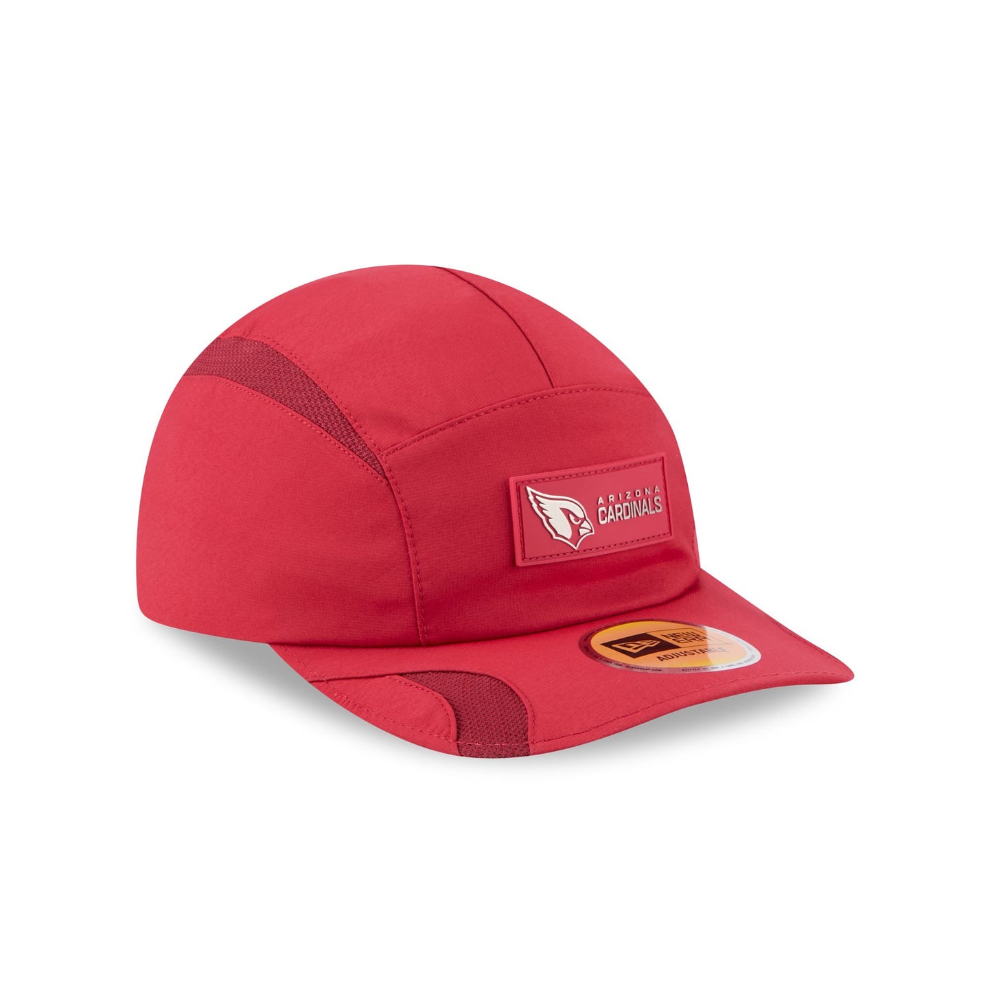 The Arizona Cardinals 2025 Sideline Hot Weather Runner Adjustable Cap features a sewn-down silicone Cardinals logo patch at the front panels with a water-repellent quill tech fabrication throughout and a quick-dry cushioned sweatband to absorb moisture. Additional details include the Official NFL Shield logo to the right of an adjustable hook-and-loop closure at the rear and mesh accents at the visor sides and side crown panels. The closure is accented with mesh a silicone transfer in the team’s colors.