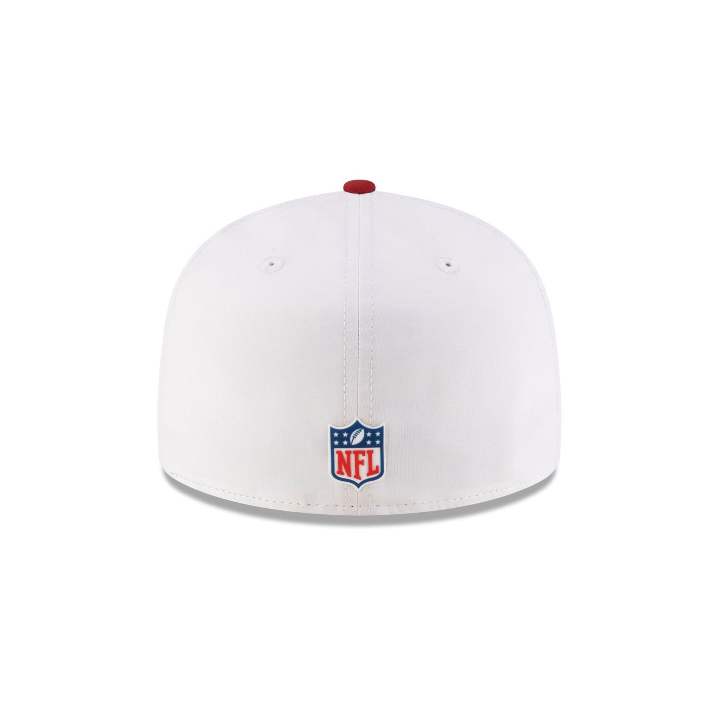 The Arizona Cardinals 2025 Training 59FIFTY Fitted Cap features a silicone Cardinals patch at the front panels with team color stripes at the front of a red visor and a silicone NFL Shield patch at the rear.