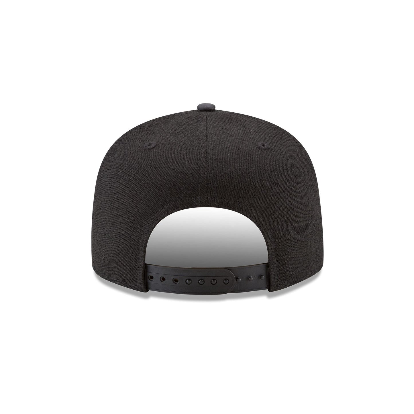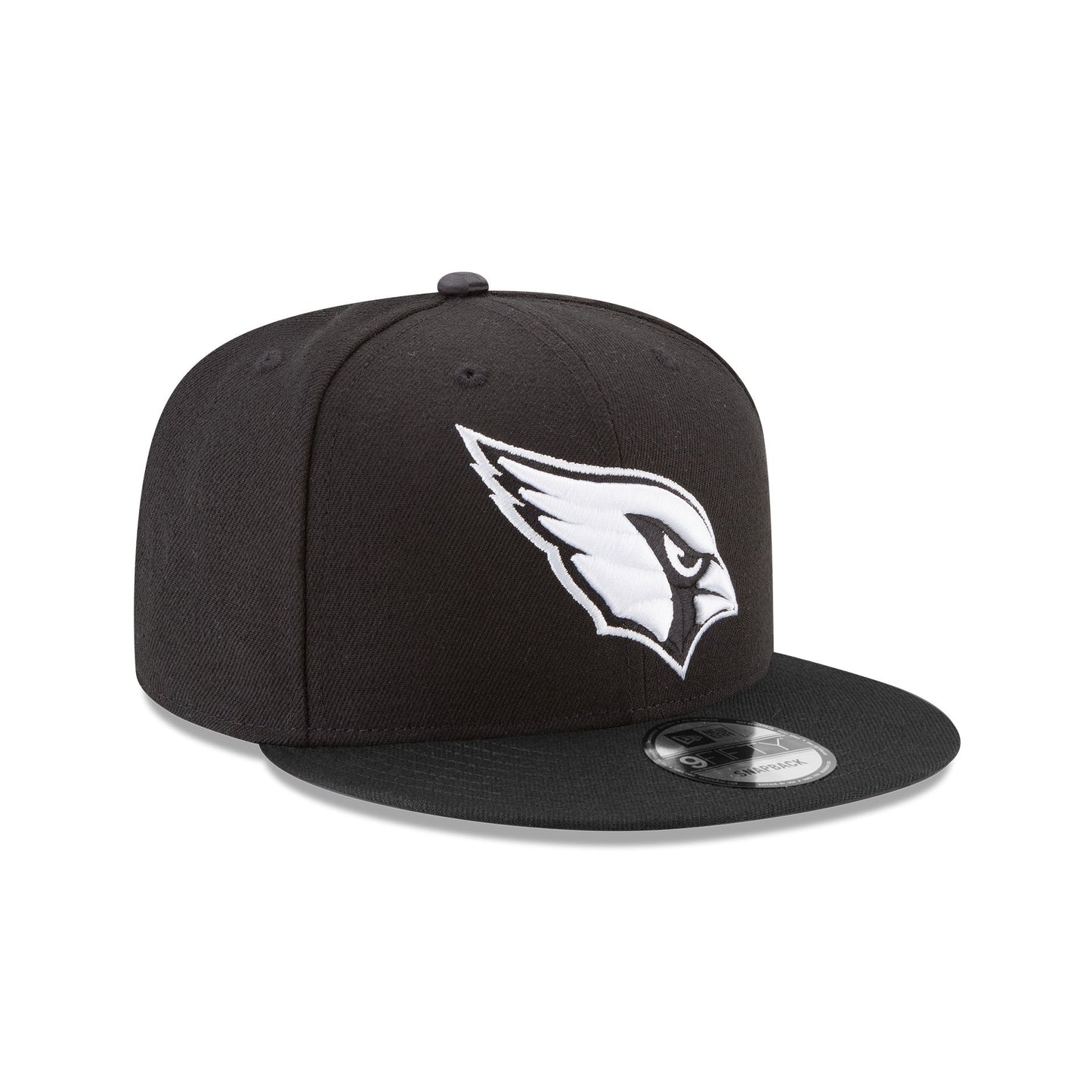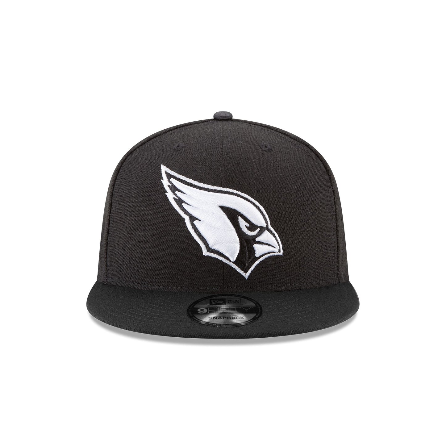 The Arizona Cardinals Black and White 9FIFTY Snapback features an allover black fabrication with a black and white Cardinals logo at the front panels with an adjustable snapback closure at the rear.