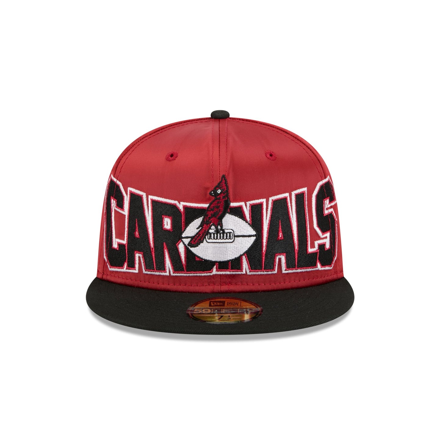 The Arizona Cardinals Bold Satin 59FIFTY Fitted Cap features an embroidered satin Cardinals Historic graphic at the front panels with a satin fabrication throughout. Additional details include a matching NFL Shield logo at the rear and a gray undervisor.