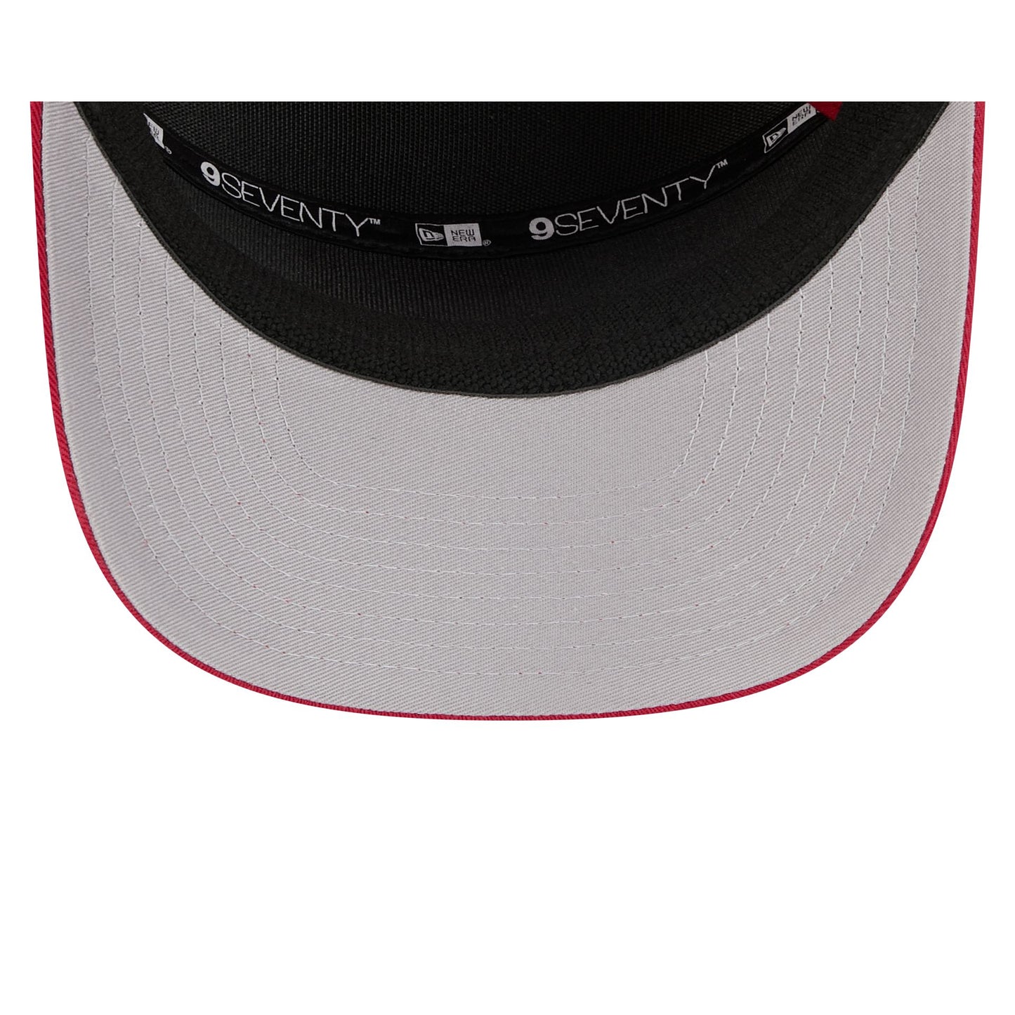The Arizona Cardinals Split Panel 9SEVENTY Stretch-Snap features an embroidered Cardinals logo at the front panel with a split crown construction and a rope at the visor. Additional details include an adjustable stretch-snap closure at the rear and a gray undervisor.