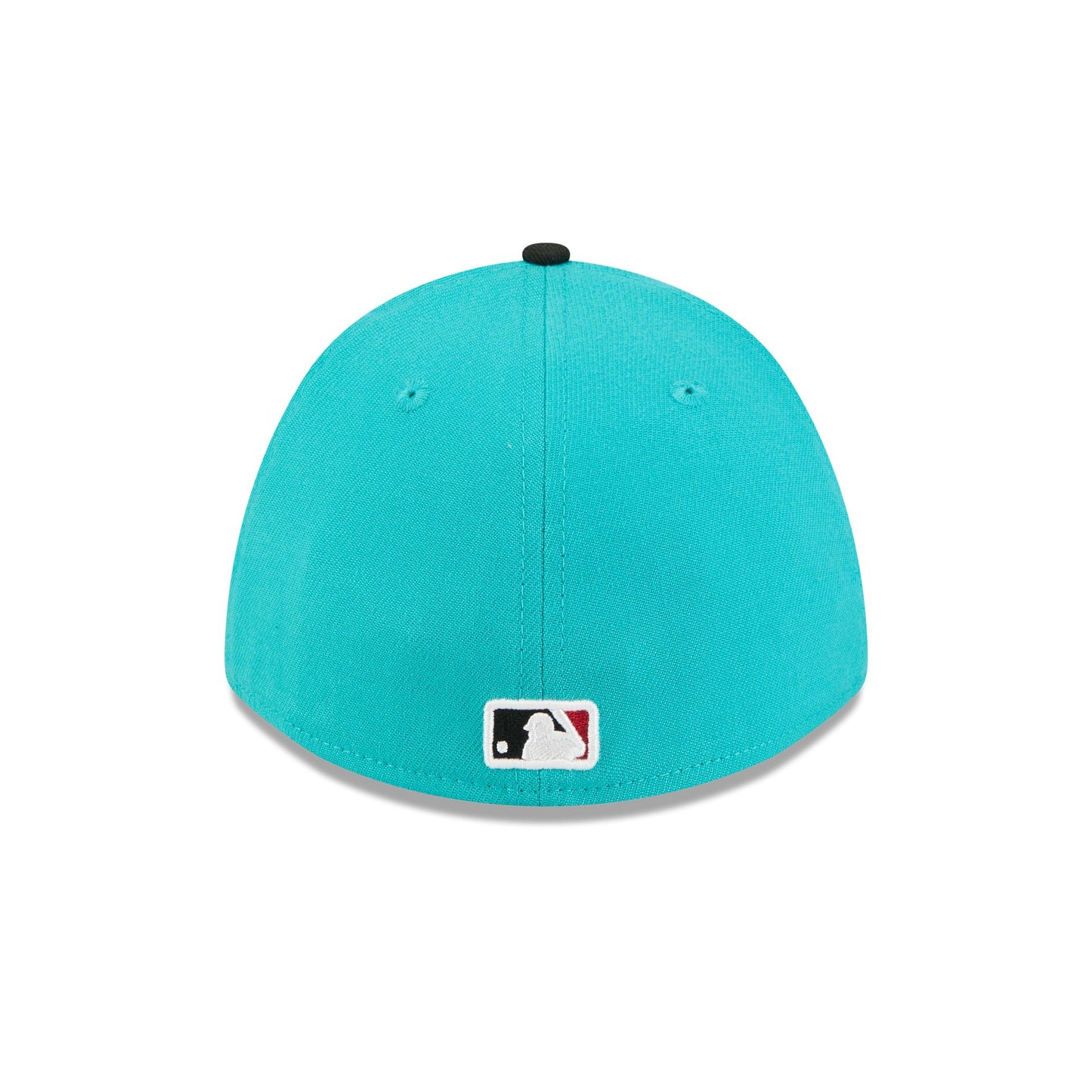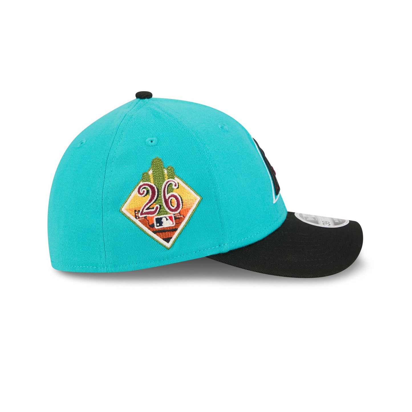 The Arizona Diamondbacks 2026 Spring Training 39THIRTY M-Crown Stretch Fit features an embroidered floral Diamondbacks logo at the front panels with a 2026 Spring Training patch at the right-wear side and the MLB Batterman logo at the rear. Additional details include an embroidered spring training location at a gray undervisor and a floral lining.