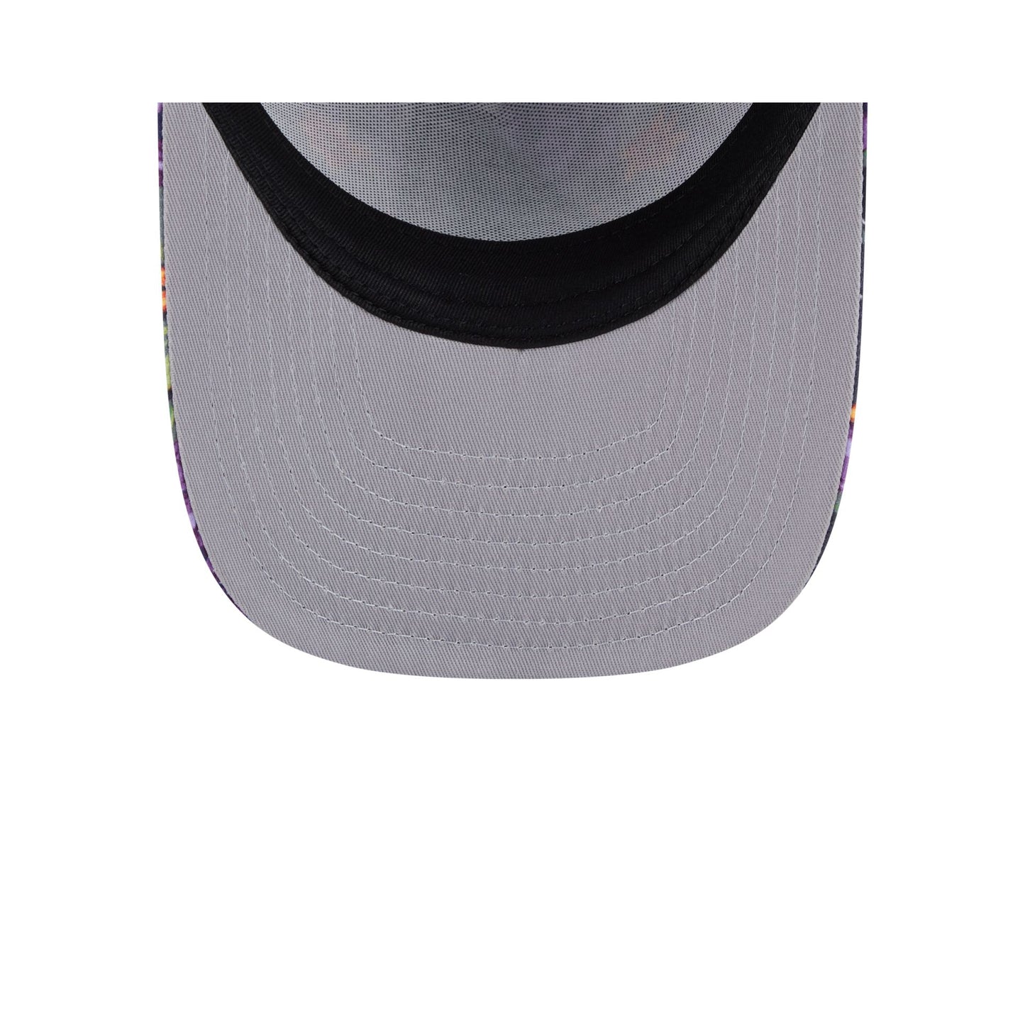 The Arizona Diamondbacks Day of the Dead Skull & Roses 9FIFTY A-Frame Snapback features an embroidered Diamondbacks logo at the front panels with a skull and purple roses print throughout. Additional details include an adjustable snapback closure at the rear and a gray undervisor.