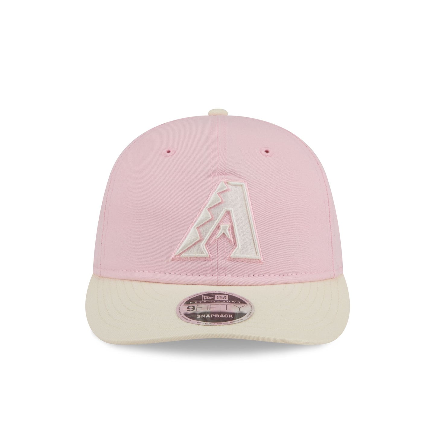 The Arizona Diamondbacks Light Pink 9FIFTY Snapback features an embroidered Diamondbacks logo at the front panels with a 2001 World Series patch at the right-wear side. Additional details include an adjustable heart-shaped snapback closure at the rear and a pink undervisor.