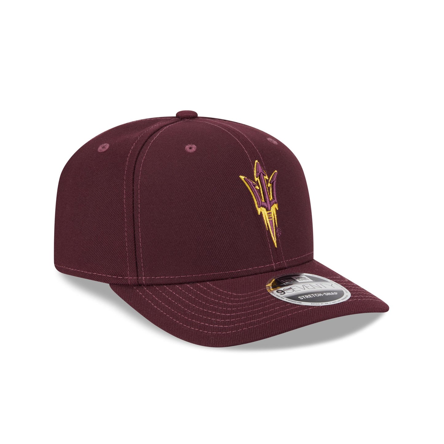 The Arizona State Sun Devils Team 9SEVENTY Stretch-Snap Cap features an embroidered Sun Devils logo at the front panels with an alternate team logo above a snapback closure at the rear and a gray undervisor.