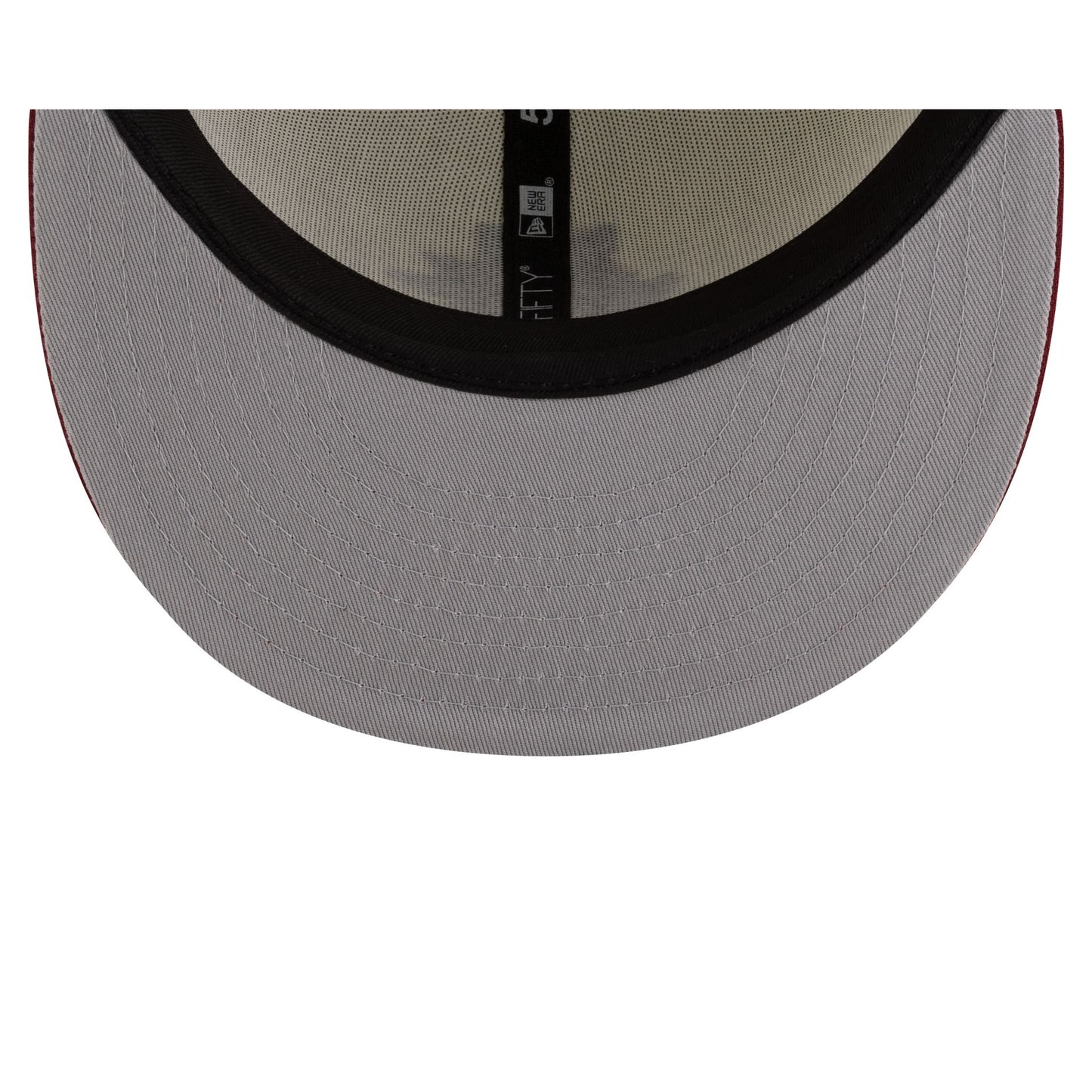 The Arkansas Razorbacks College Vault Chrome 59FIFTY Fitted Cap features an embroidered Razorbacks logo at the front panels with a patch at the right-wear side and a wordmark at the rear.