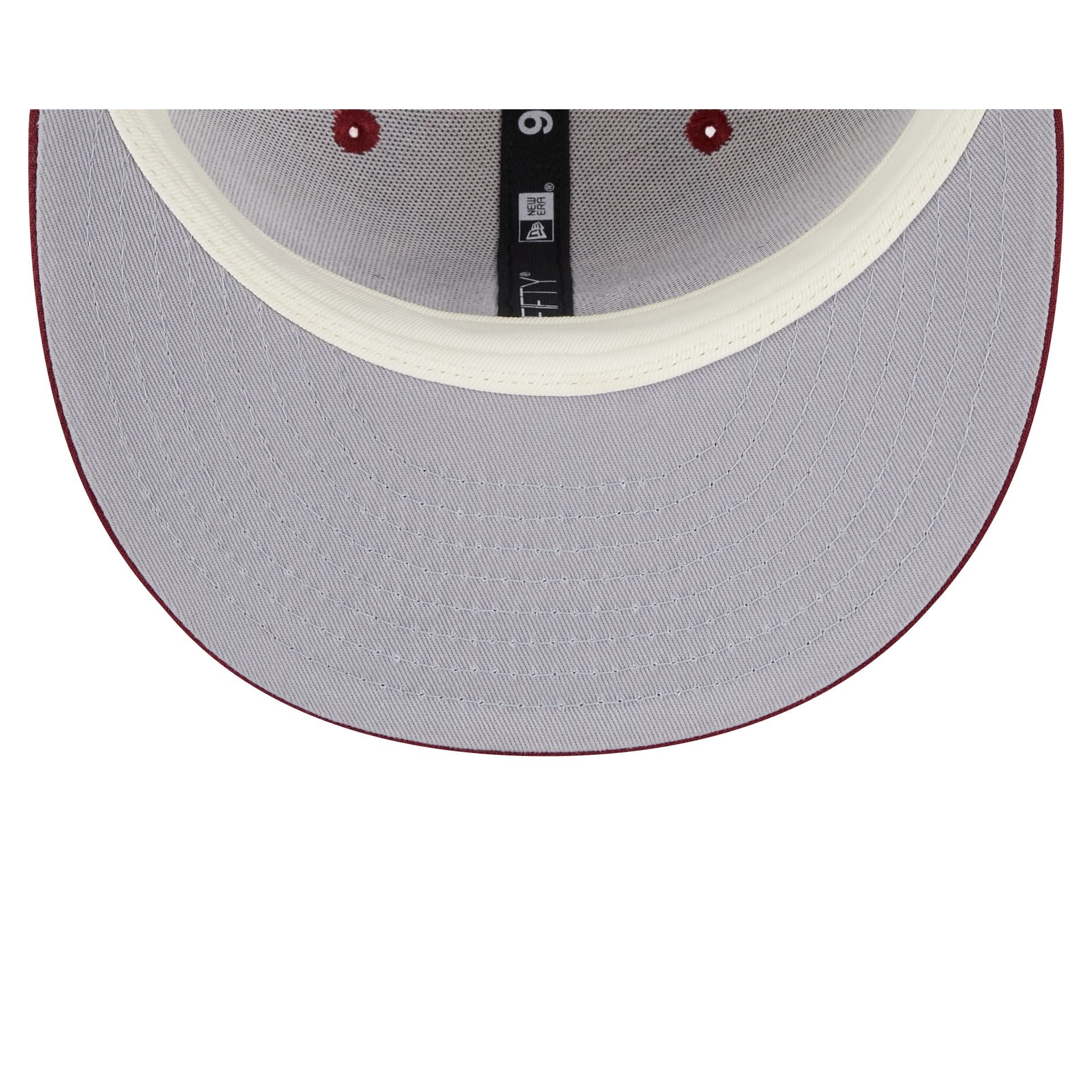 The Arkansas Razorbacks Plaid 9FIFTY Snapback features an embroidered Razorbacks logo at the front panels against a matching plaid pattern. Additional details include a team logo above a snapback closure at the rear and a gray undervisor.