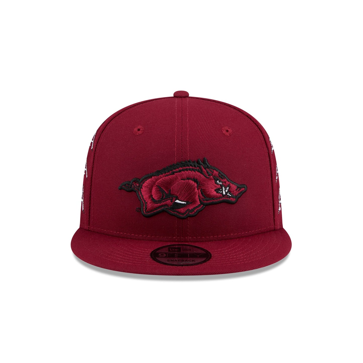 The Arkansas Razorbacks Sticker Helmet 9FIFTY Snapback features an embroidered Razorbacks logo at the front panels with embroidered team stickers the back panels. Additional details include an adjustable snapback closure at the rear and a gray undervisor.