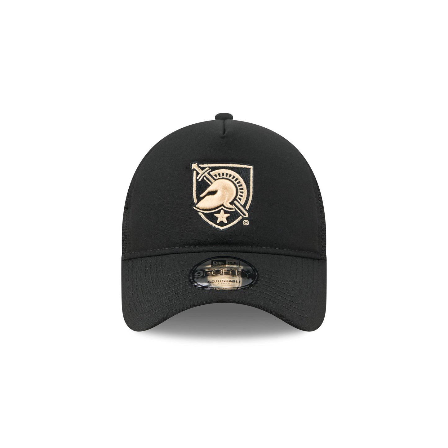 The Army Black Knights Go-To 9FORTY A-Frame Trucker features an embroidered Black Knights logo at the front panels with a snapback closure at a mesh rear.