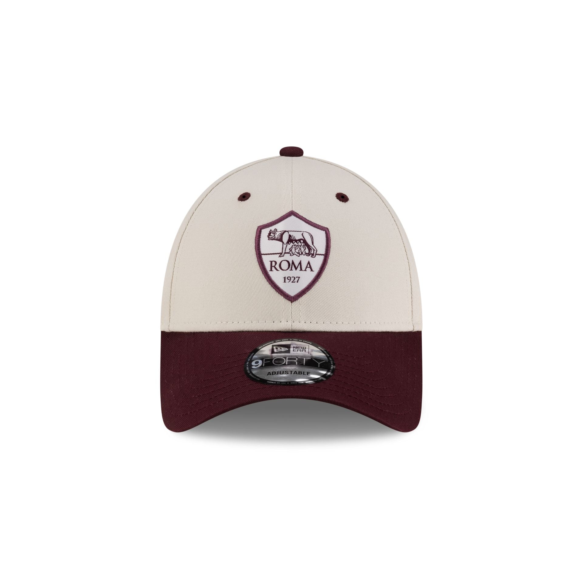 The AS Roma Ivory 9FORTY Adjustable Cap features an embroidered Roma logo at the front panels with an adjustable D-Ring closure at the rear and a maroon visor.