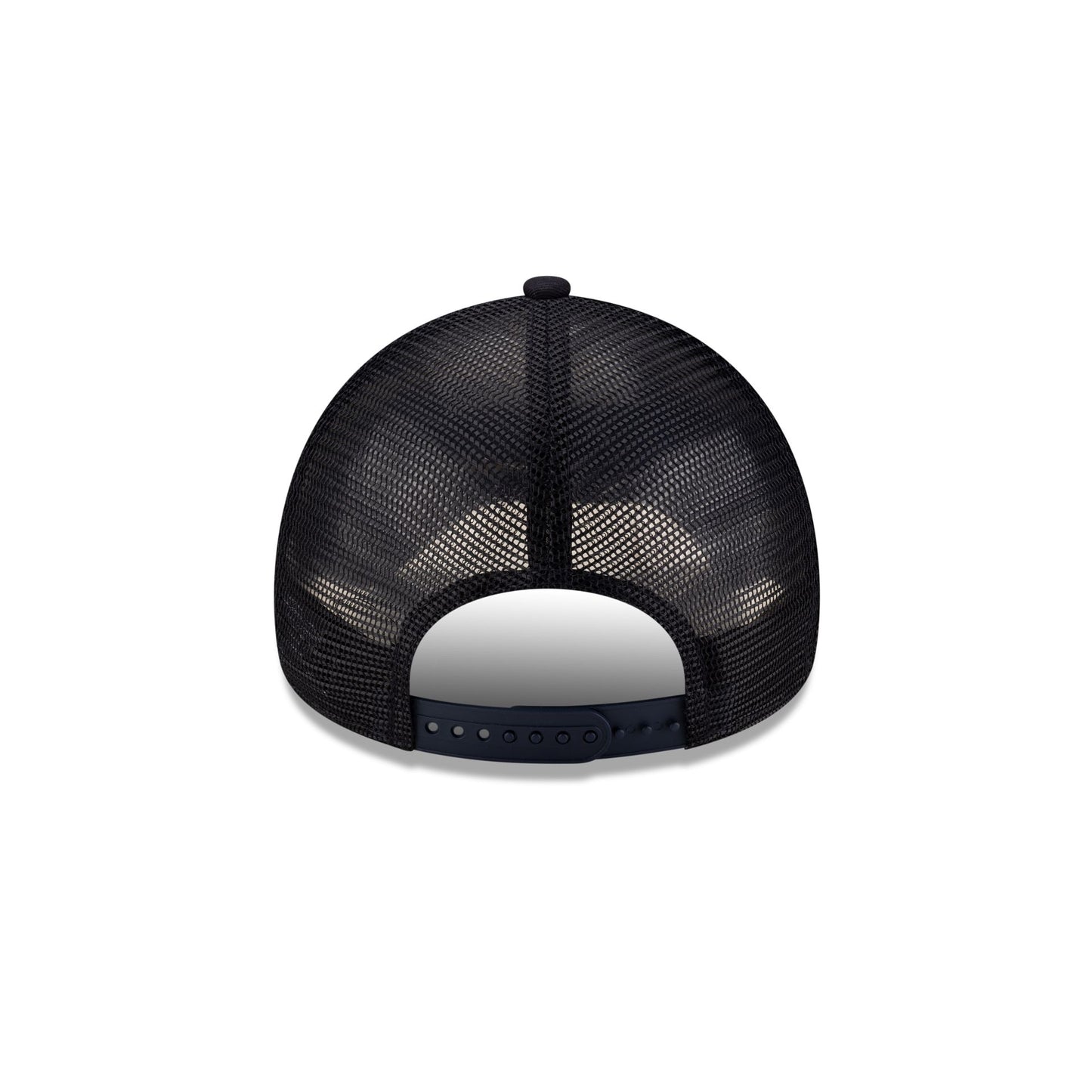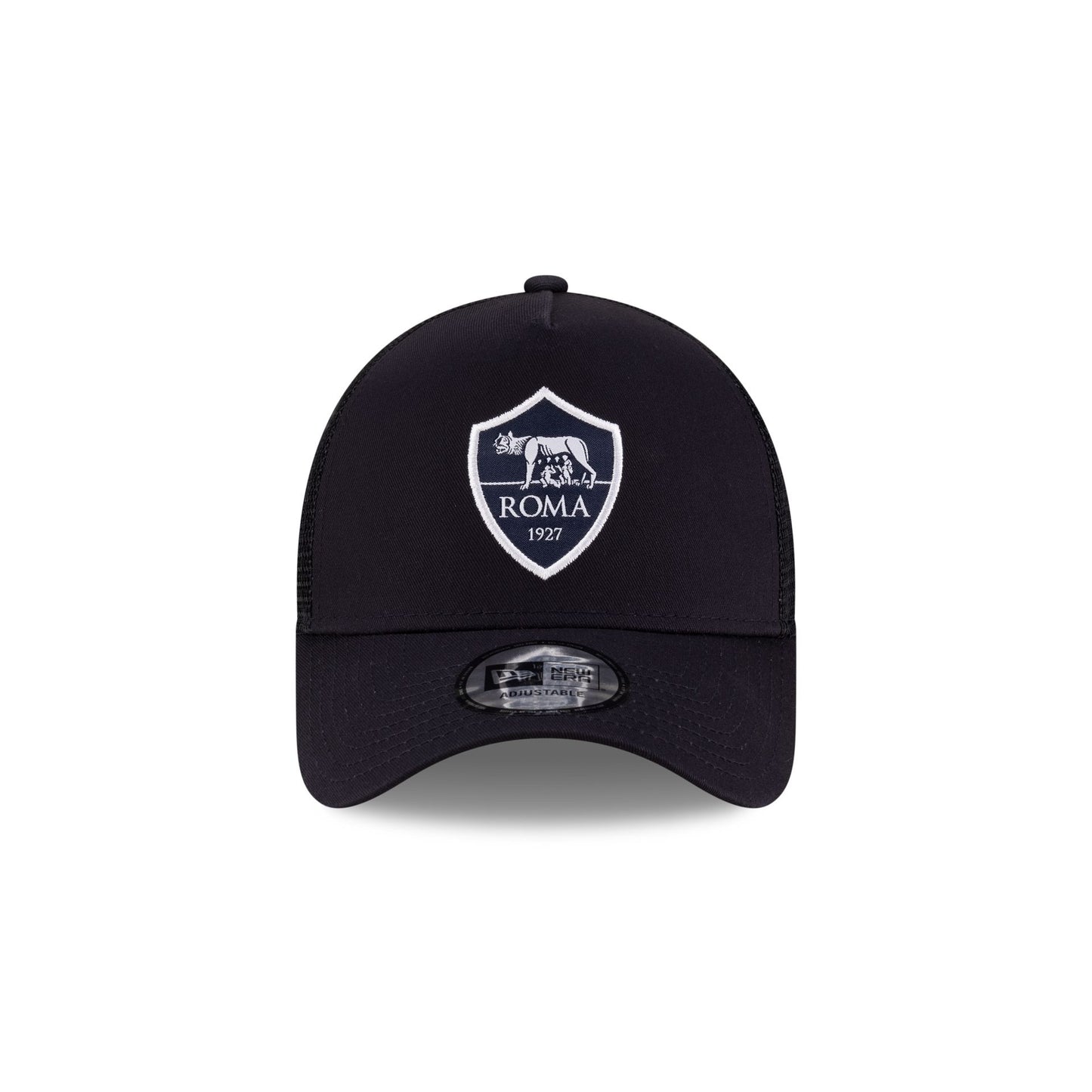 The AS Roma Seasonal Navy 9FORTY A-Frame Trucker features an embroidered Roma logo at the front panels with an adjustable snapback closure at the rear.