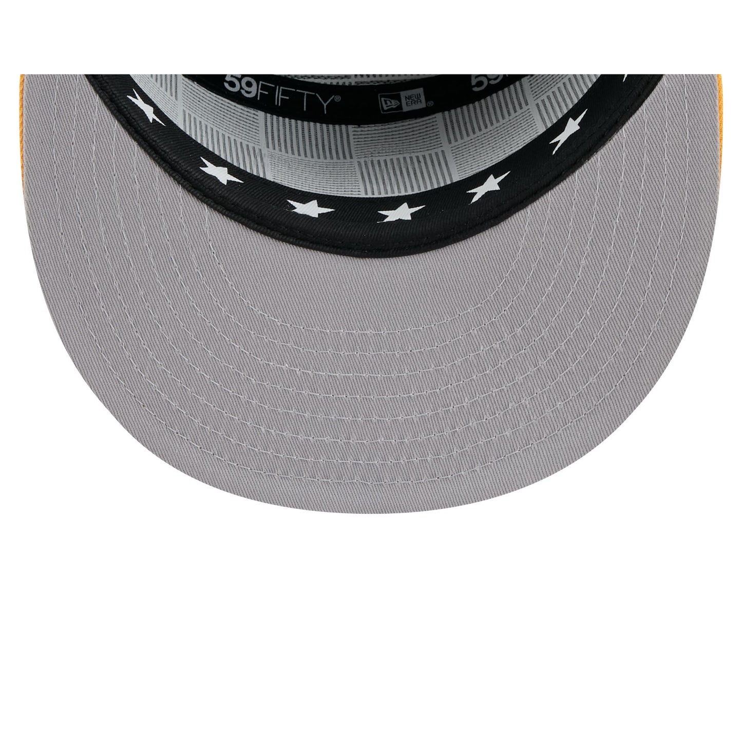 The Athletics 2025 All-Star Game Split Panel 59FIFTY Fitted Cap features an embroidered Athletics logo at the front panels against a split-crown construction with breathable mesh fabric at the side and rear panels. Additional details include stars at the top panel, a 2025 All-Star Game patch at the right-wear side, the MLB Batterman logo at the rear, and a gray undervisor. The cap also features screen-printed stars on the sweatband.