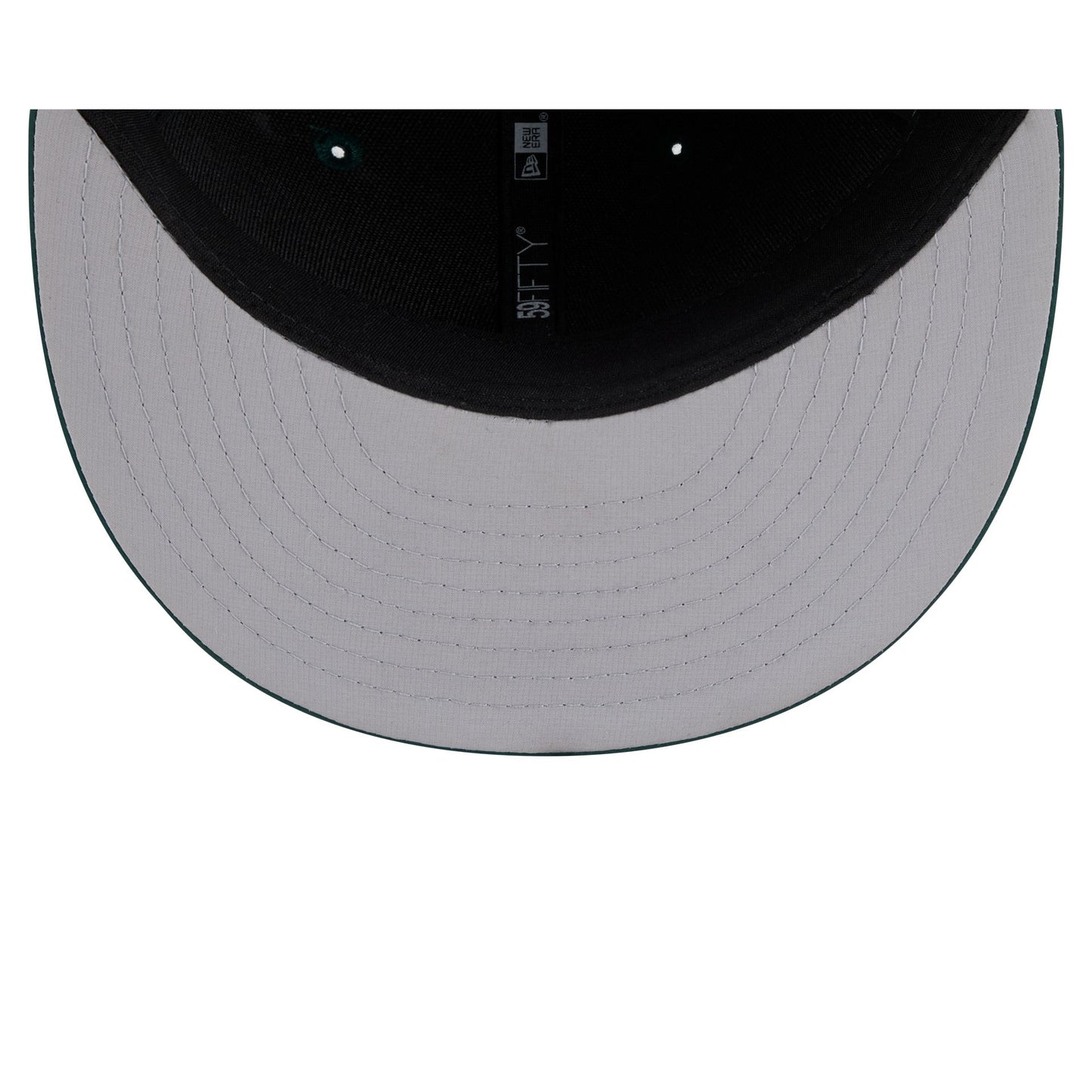 The Athletics 2026 Clubhouse 59FIFTY Fitted Cap features a sewn-down silicone Athletics logo patch at the front panels with a water-repellent quill tech fabrication throughout. Additional details include a silicone MLB Batterman logo patch at the rear and a gray undervisor. The visor is accented with a silicone transfer team patch.