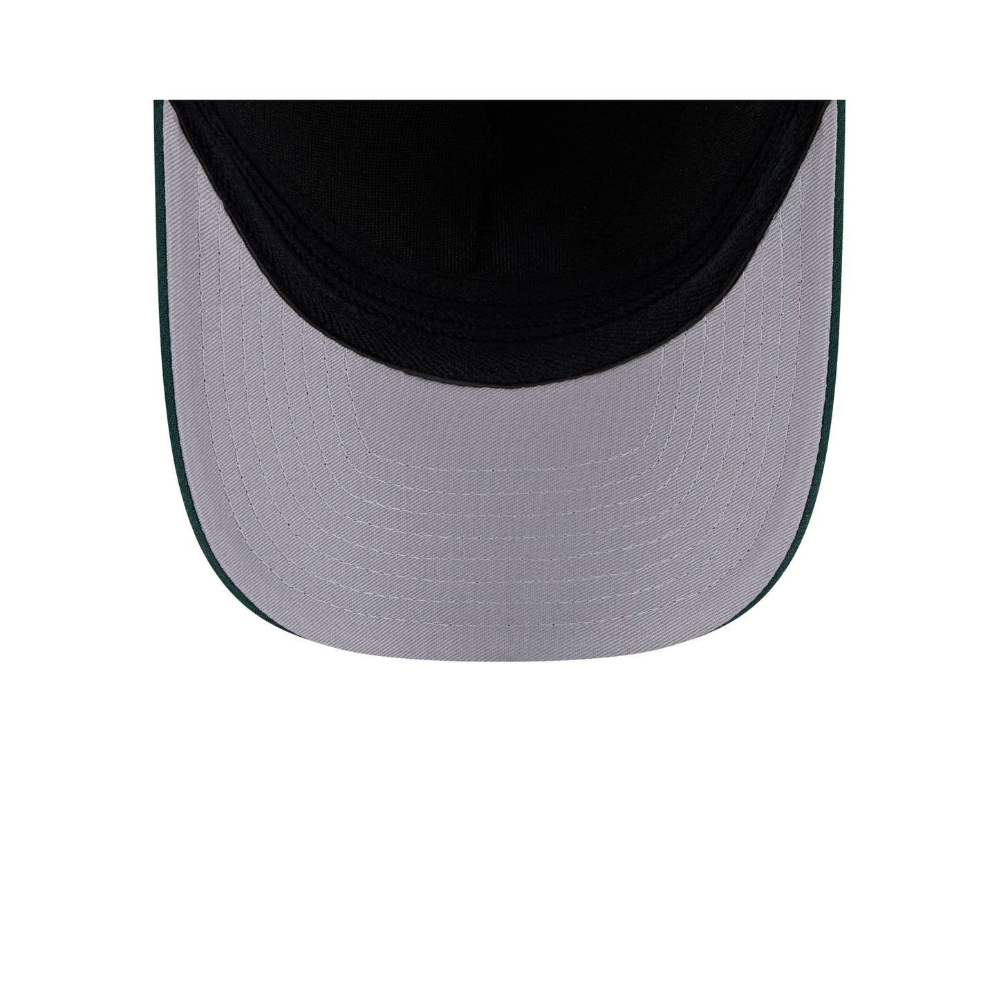The Athletics 39THIRTY M-Crown A-Frame Stretch Fit Cap features an embroidered Athletics logo at the front panel with a matching team wordmark at the rear and a gray undervisor. Additional details include a Performance Stretch sweatband and a New Era Flag at the left-wear side.