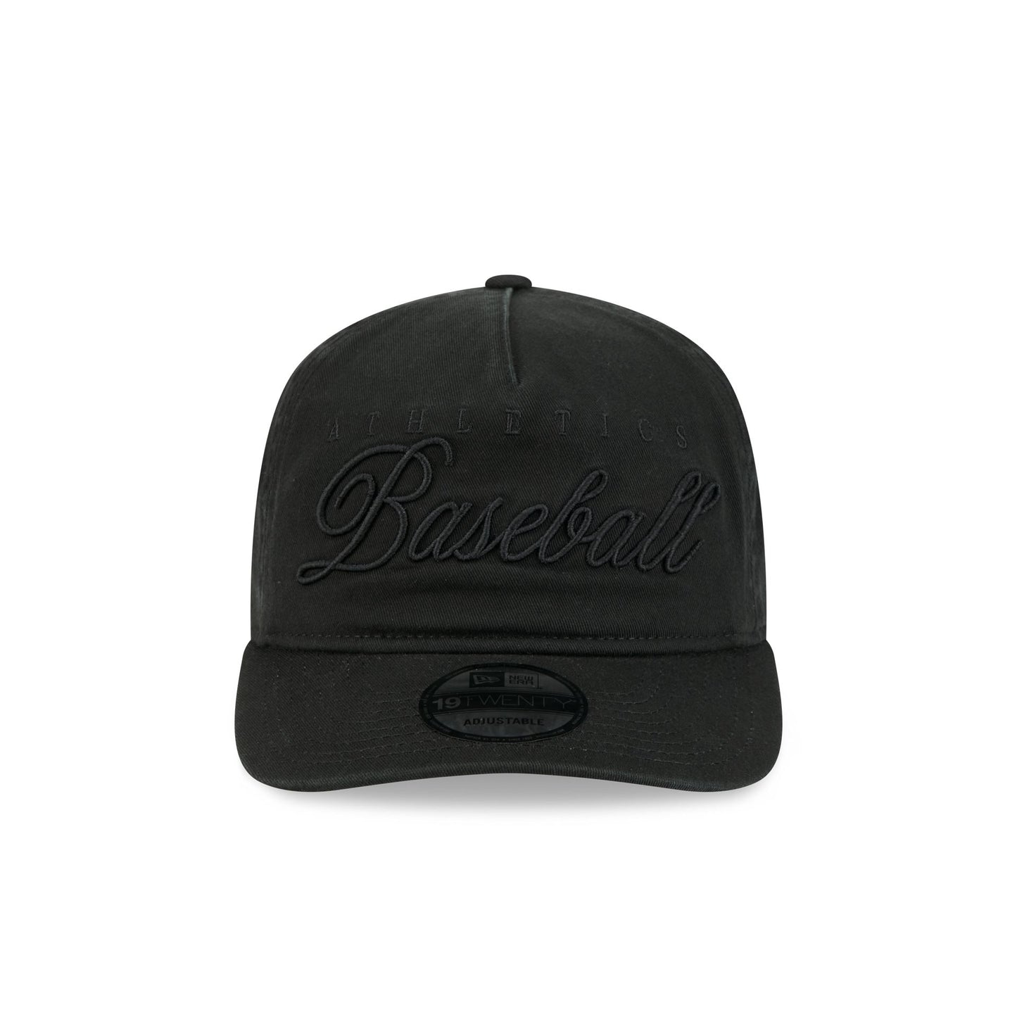 The Athletics All Black Scripted 19TWENTY Adjustable Cap features an embroidered Athletics all black script wordmark at the front panels with a matching team logo at the right-wear side. Additional details include an adjustable snapback closure at the rear and a gray undervisor.