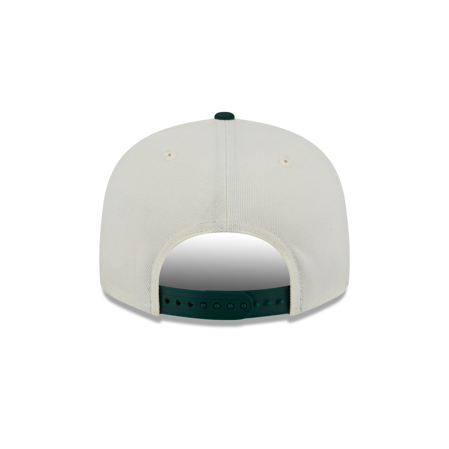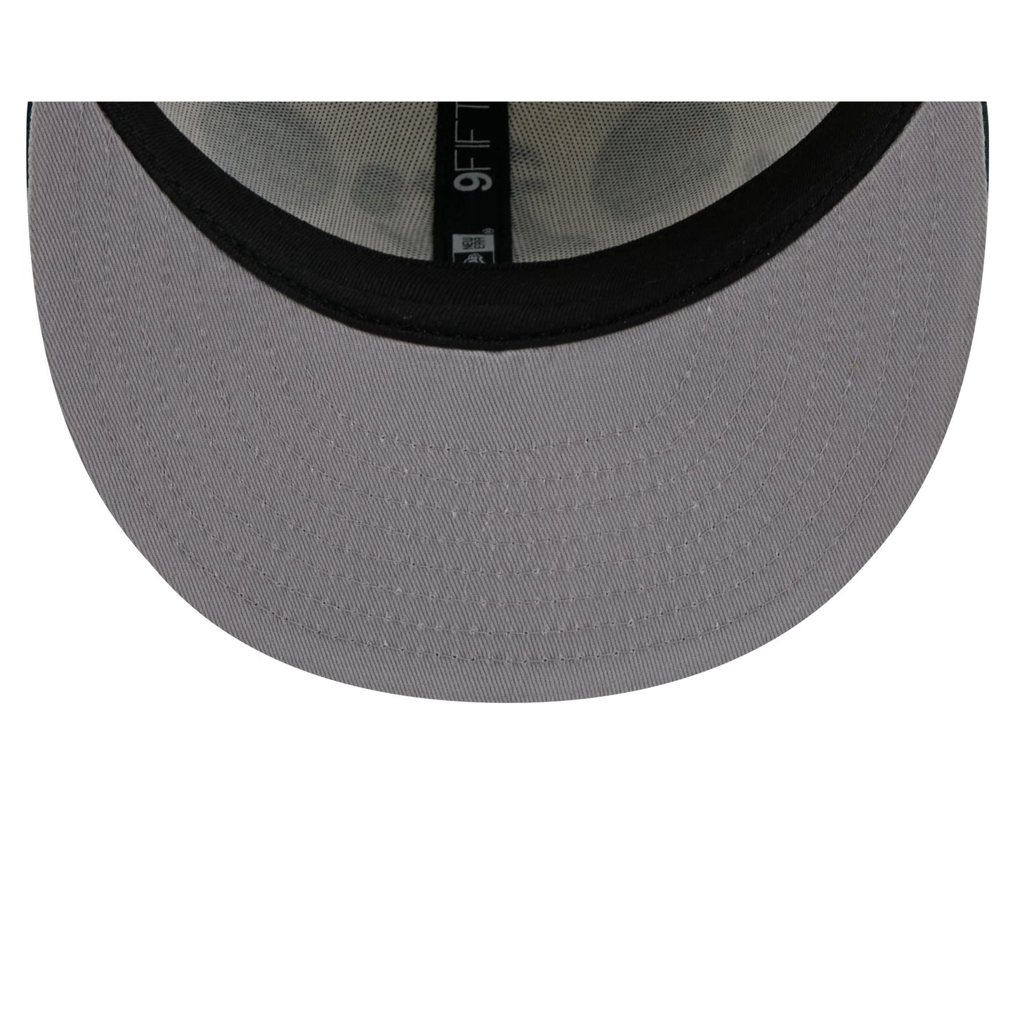 The Athletics Archive 9FIFTY Snapback features an embroidered Athletics wordmark and various team logos at the front panels with a snapback closure at the rear and a gray undervisor.
