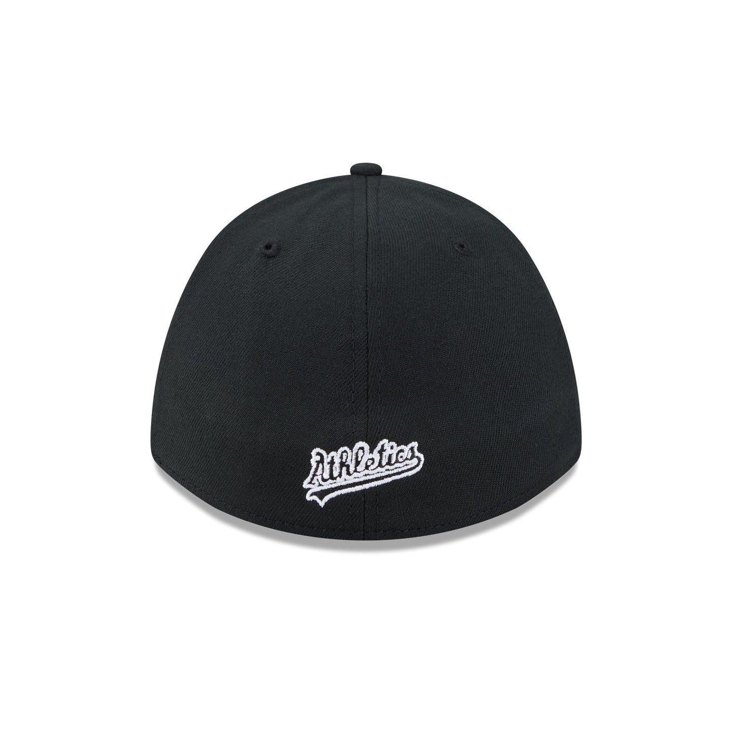 The Athletics Black and White 39THIRTY M-Crown Stretch Fit Cap features an embroidered Athletics logo at the front panels with a matching team wordmark at the rear and a gray undervisor. Additional details include a shorter, more modern visor with a Performance Stretch sweatband and a New Era Flag at the left-wear side.