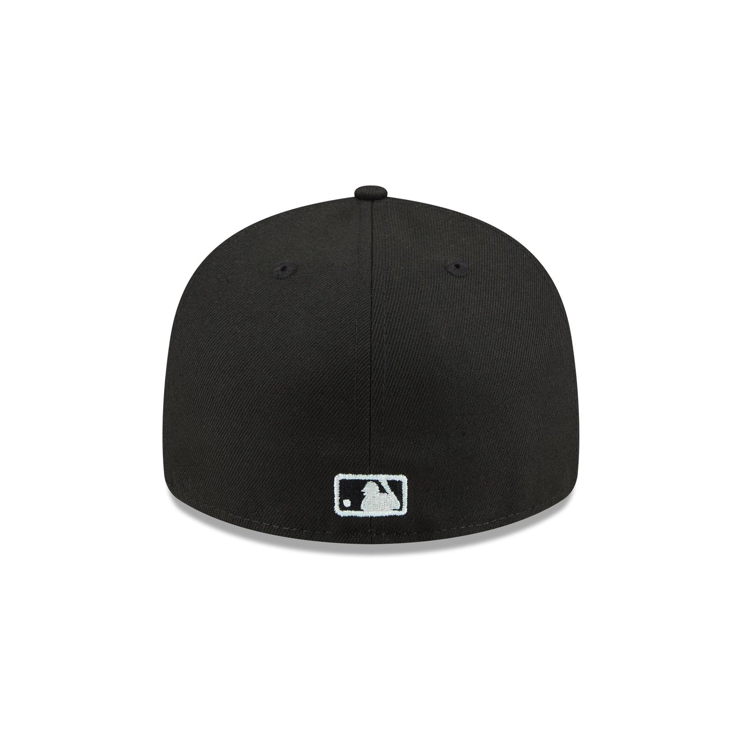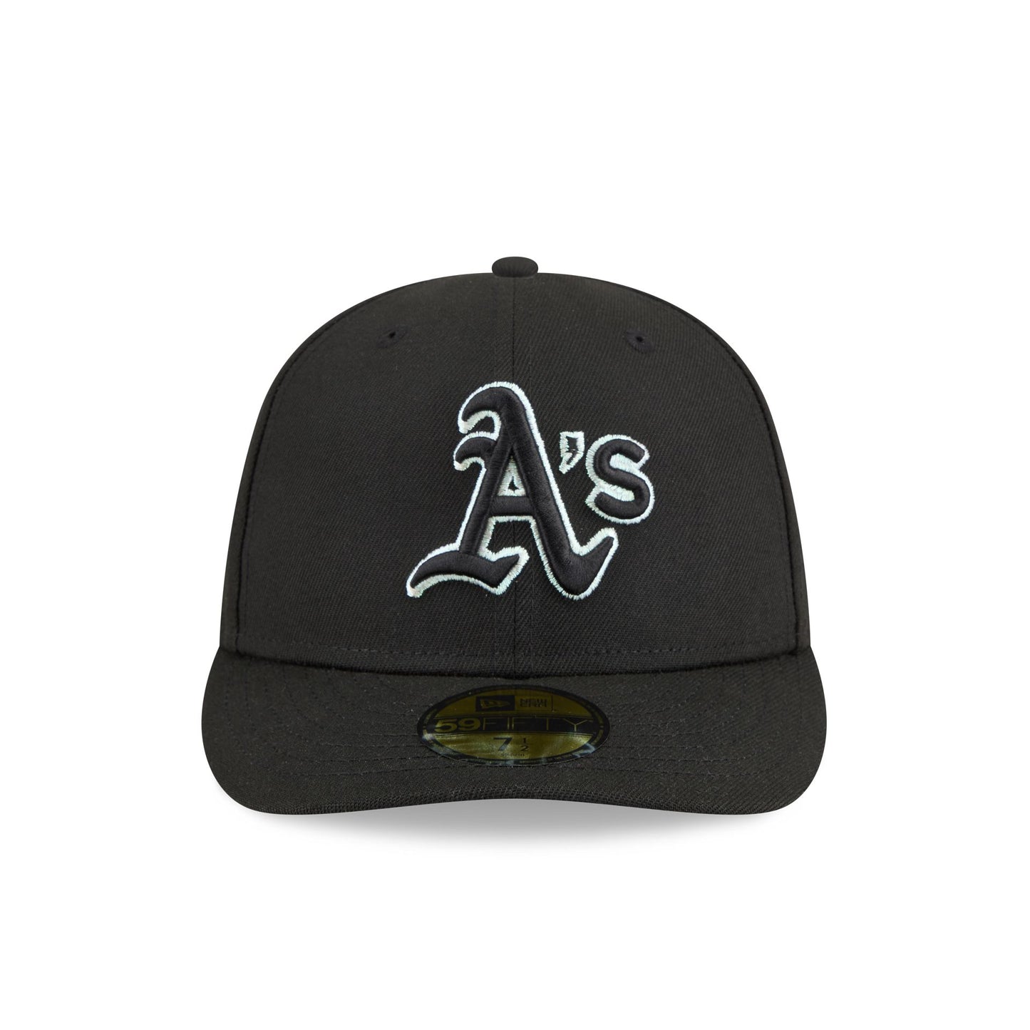 The Athletics Black Pre-Curve 59FIFTY Fitted Cap features an embroidered black and white Athletics logo at the front panels with a matching MLB Batterman logo at the rear, a pre-curved visor, and a gray undervisor.