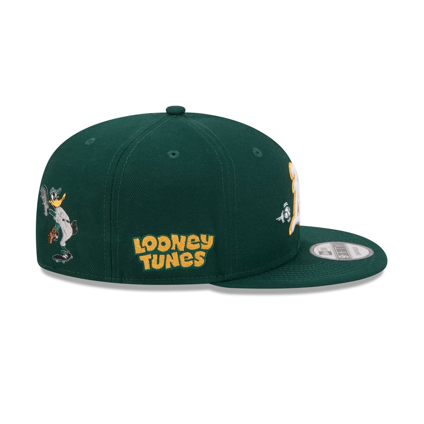 The Athletics Daffy Duck Catch 9FIFTY Snapback features an embroidered Athletics logo and Daffy Duck batting graphic at the front panels with a Looney Tunes logo at the right-wear side. Additional details include a Daffy Duck script wordmark above an adjustable snapback closure at the rear and the character's graphic to the right.