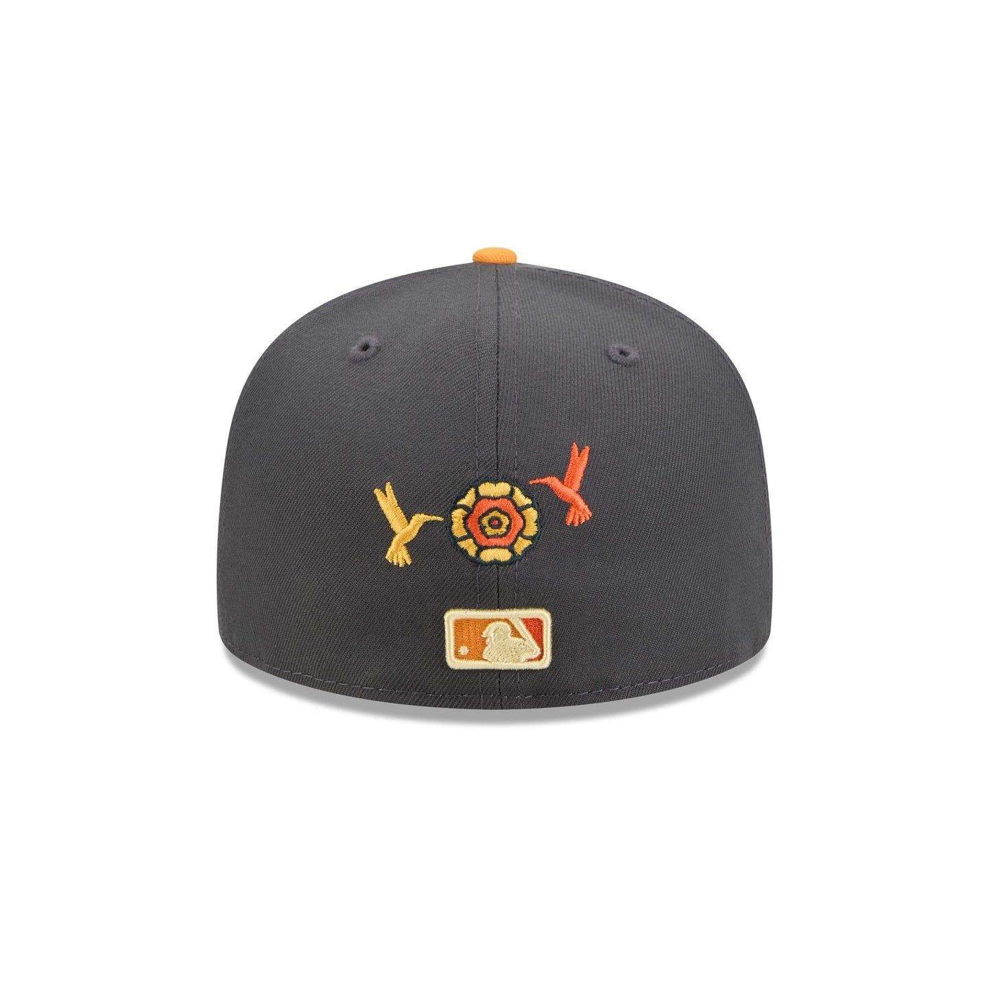 The Athletics Day of the Dead Graphite 59FIFTY Fitted Cap features an embroidered Athletics logo at the front panels with marigold (cempasúchil) and hummingbird designs throughout, representing the Legend of Xóchitl and Huitzilin. Additional details include a team patch at the right-wear side and a matching MLB Batterman logo at the rear.