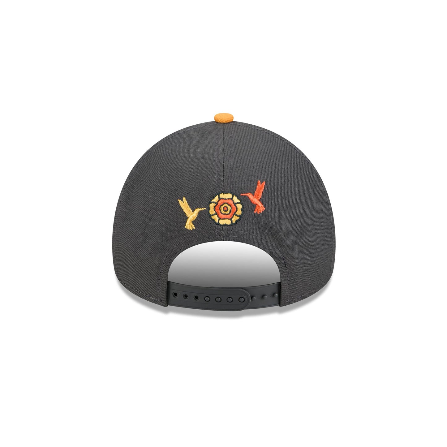 The Athletics Day of the Dead Graphite 9FORTY A-Frame Snapback features an embroidered Athletics logo at the front panels with marigold (cempasúchil) and hummingbird designs throughout, representing the Legend of Xóchitl and Huitzilin. Additional details include a team patch at the right-wear side and an adjustable snapback closure at the rear.