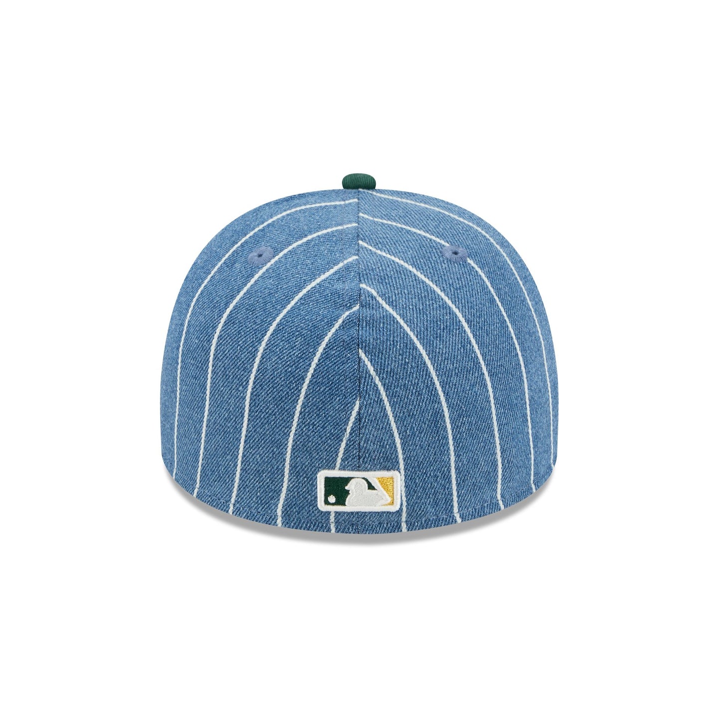 The Athletics Parallel 59FIFTY A-Frame Fitted Cap features an embroidered Athletics parallel stitch logo at the front panels against a denim pinstripe fabrication throughout. Additional details include a matching MLB Batterman logo at the rear and a gray undervisor.