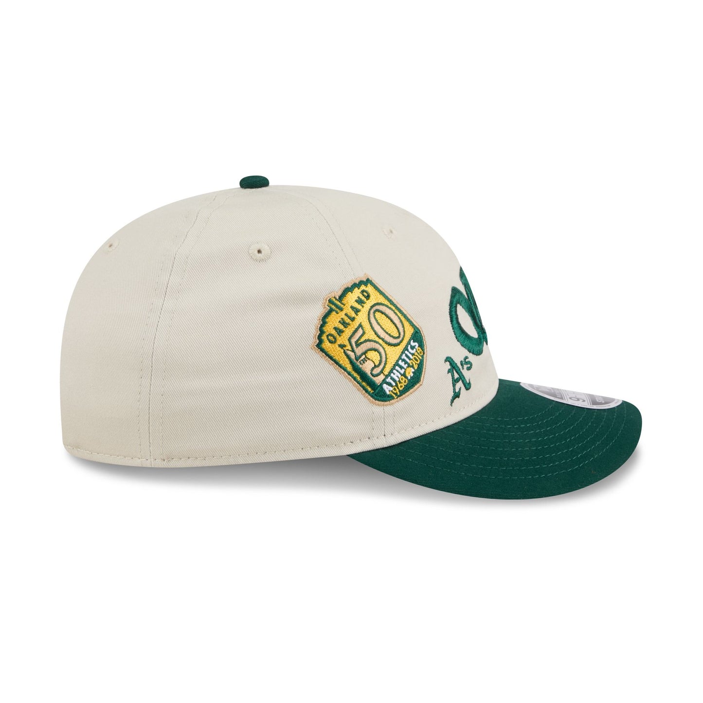 The Athletics Scattered Patches Retro Crown 9FIFTY Snapback features an embroidered Athletics city abbreviation with multiple team logos and patches at the front panels. Additional details include a team wordmark above a snapback closure at the rear with a team color visor and a gray undervisor.