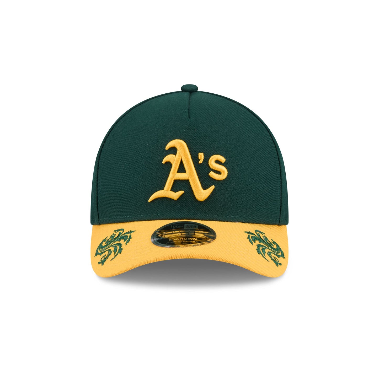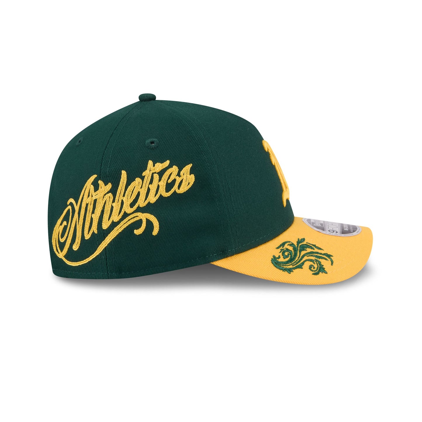 The Athletics Script 9FORTY M-Crown A-Frame Snapback features an embroidered Athletics logo at the front panel with an adjustable snapback closure at the rear. Additional details include a team script at the right-wear side with ornamental details throughout the cap and a gray undervisor.