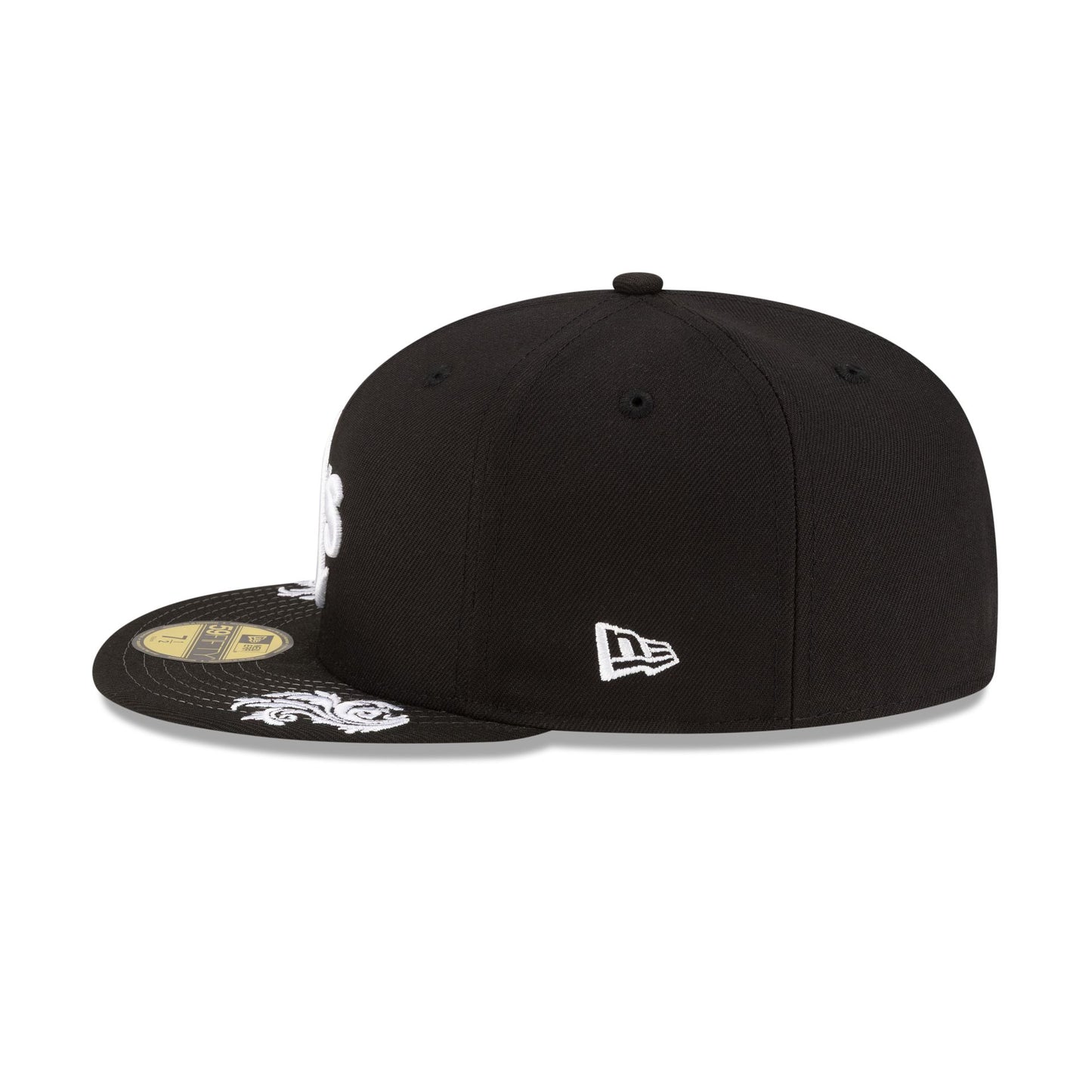 The Athletics Script Black and White 59FIFTY Fitted Cap features an embroidered Athletics logo at the front panels with a matching MLB Batterman logo at the rear. Additional details include a team script at the right-wear side with ornamental details throughout the cap and a gray undervisor.