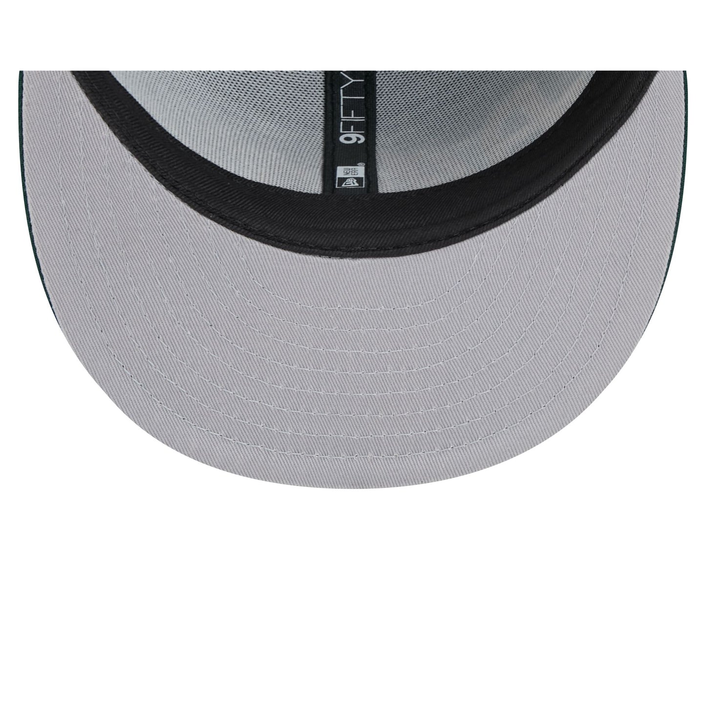 The Athletics Kids 9FIFTY Snapback Hat features an embroidered Athletics wordmark at the front panels with a matching team logo at the right-wear side. Additional details include a gray undervisor and a snapback closure at the rear.