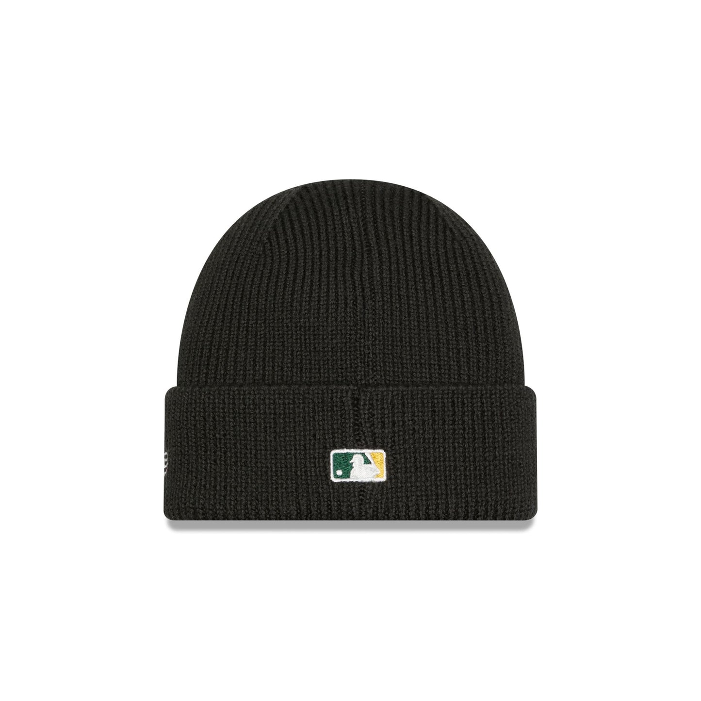 The Athletics Short Skull Cuff Knit Beanie features an embroidered Athletics logo at the front cuff with the MLB Batterman logo at the rear.
