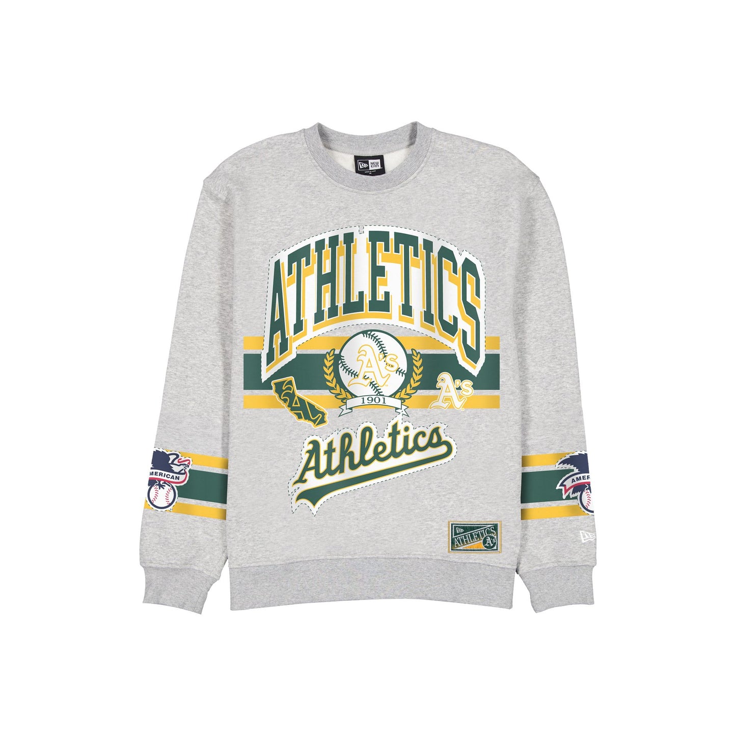 The Athletics Sport Classics Vintage Gray Oversized Crewneck features a screen-printed Athletics wordmark and graphic at the front with woven team jocktag at the bottom hem. Additional details include an American League logo with team color stripes at the sleeves.