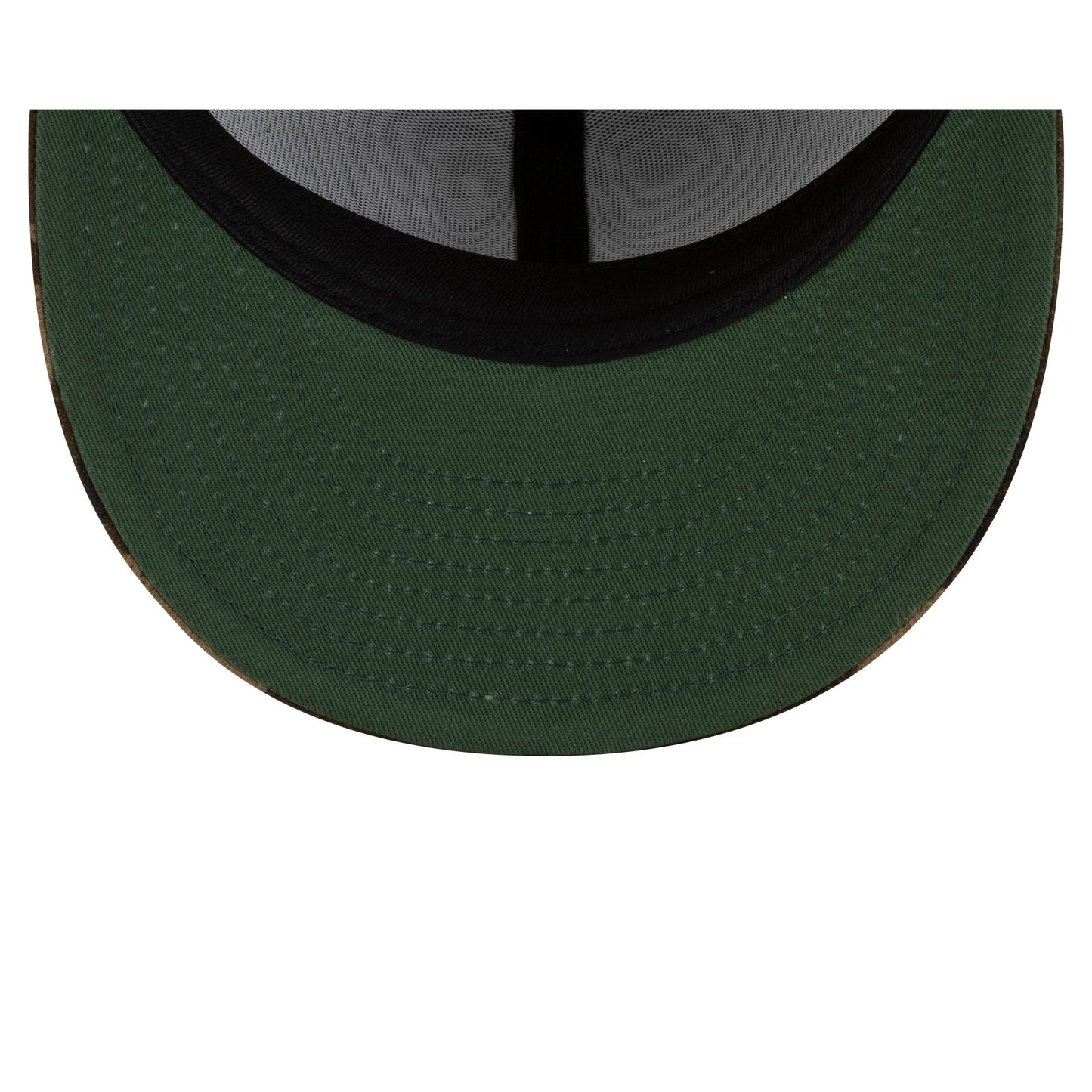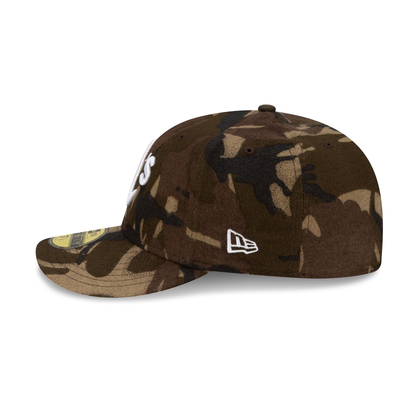 The Athletics Three Looms Camo Pre-Curve 59FIFTY Fitted Cap features an embroidered Athletics logo at the front panels with a matching MLB Batterman logo at the rear, a pre-curved visor, and a green undervisor.