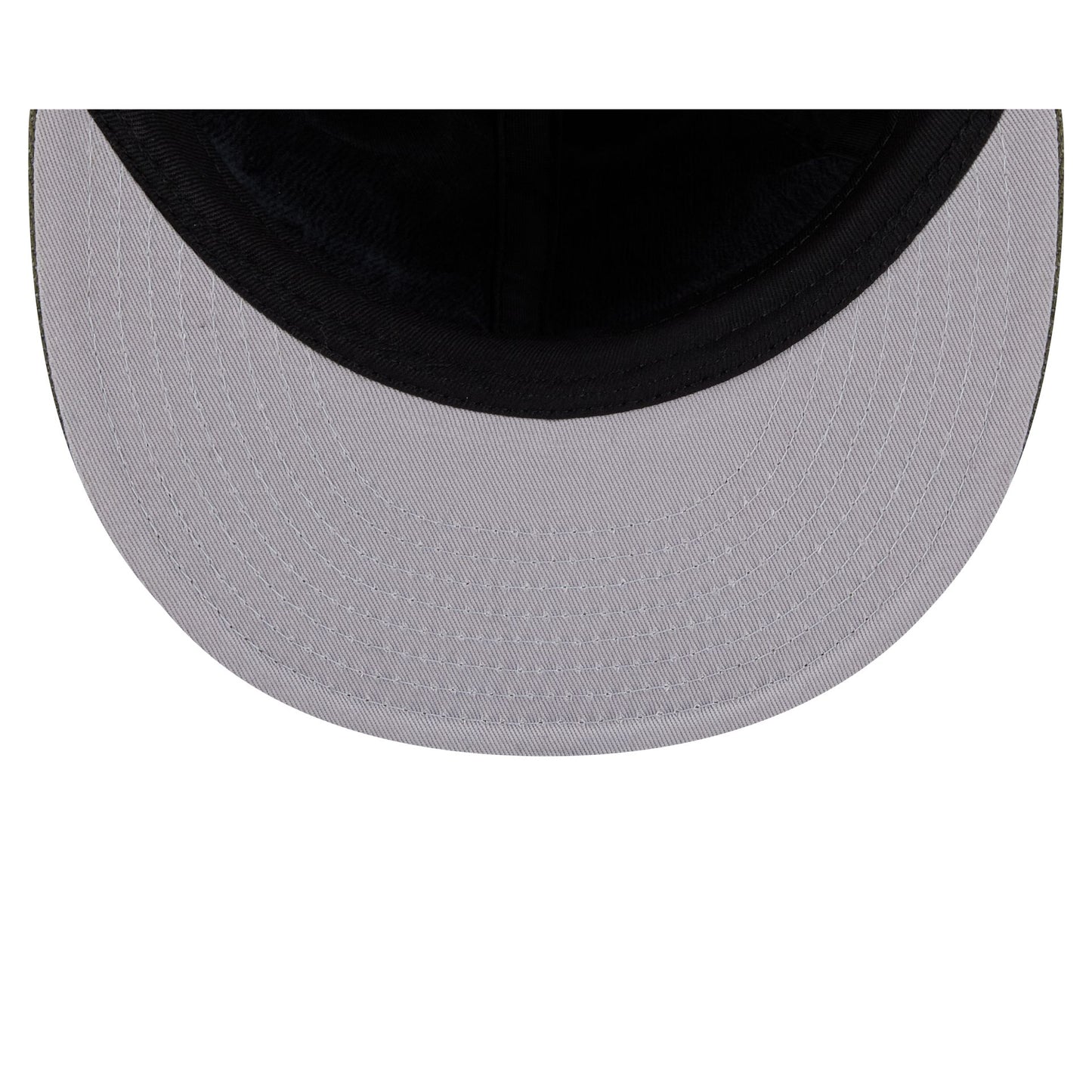 The Athletics Three Looms Cotton Twill Camo Retro Crown Dog Ear 59FIFTY Fitted features an embroidered Athletics logo at the front panels with a matching MLB Batterman logo at the rear. Additional details include fleece camo lined ear covers with a snap button closure and a gray undervisor.
