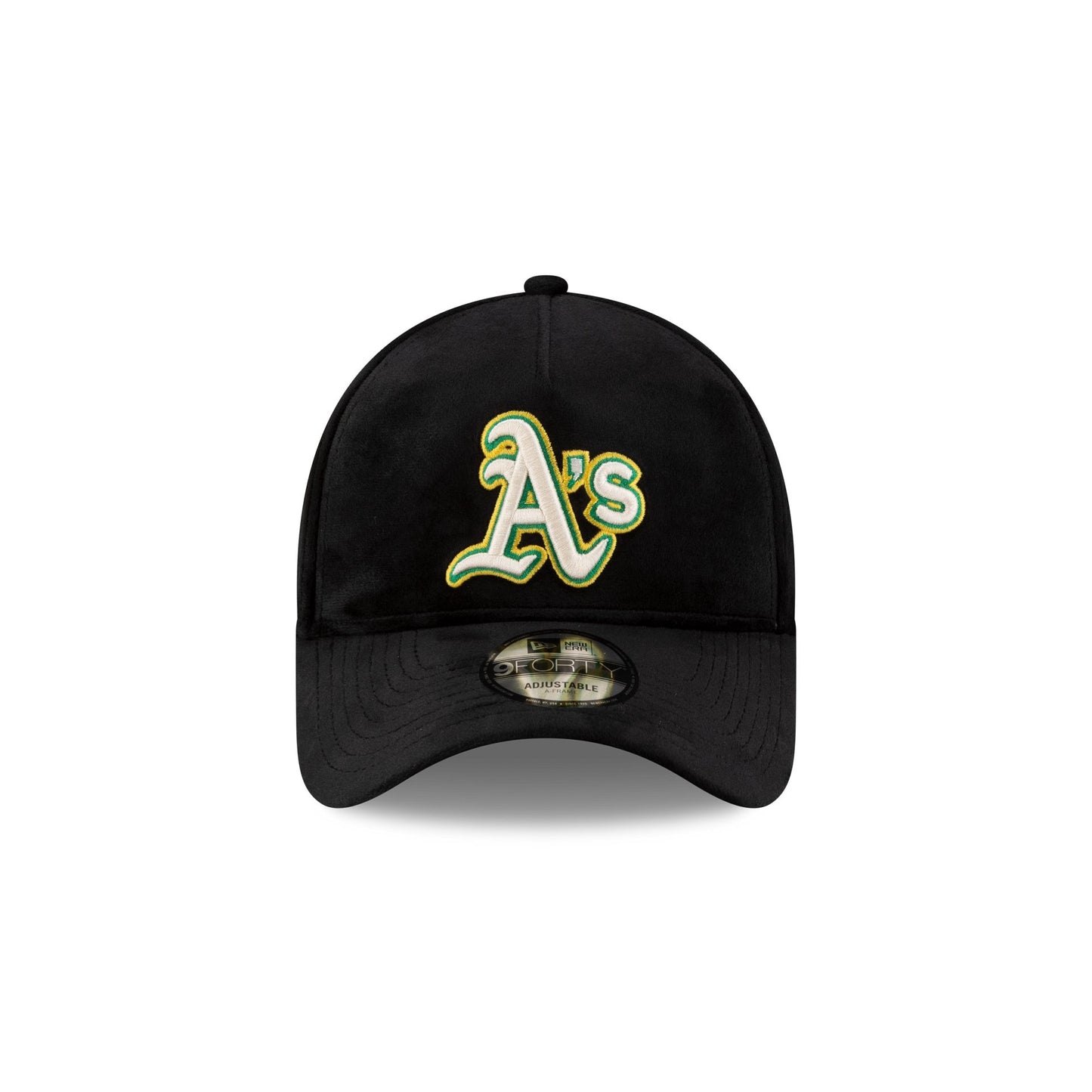 The Athletics Velour 9FORTY A-Frame Snapback features an embroidered Athletics logo at the front panel with an adjustable snapback closure at the rear and a gray undervisor.