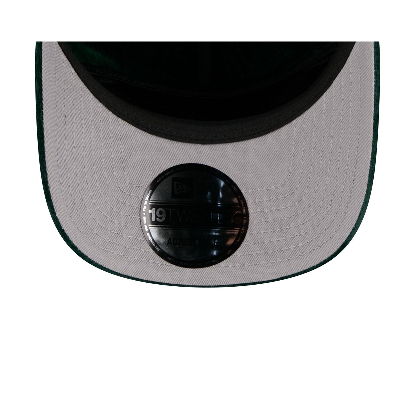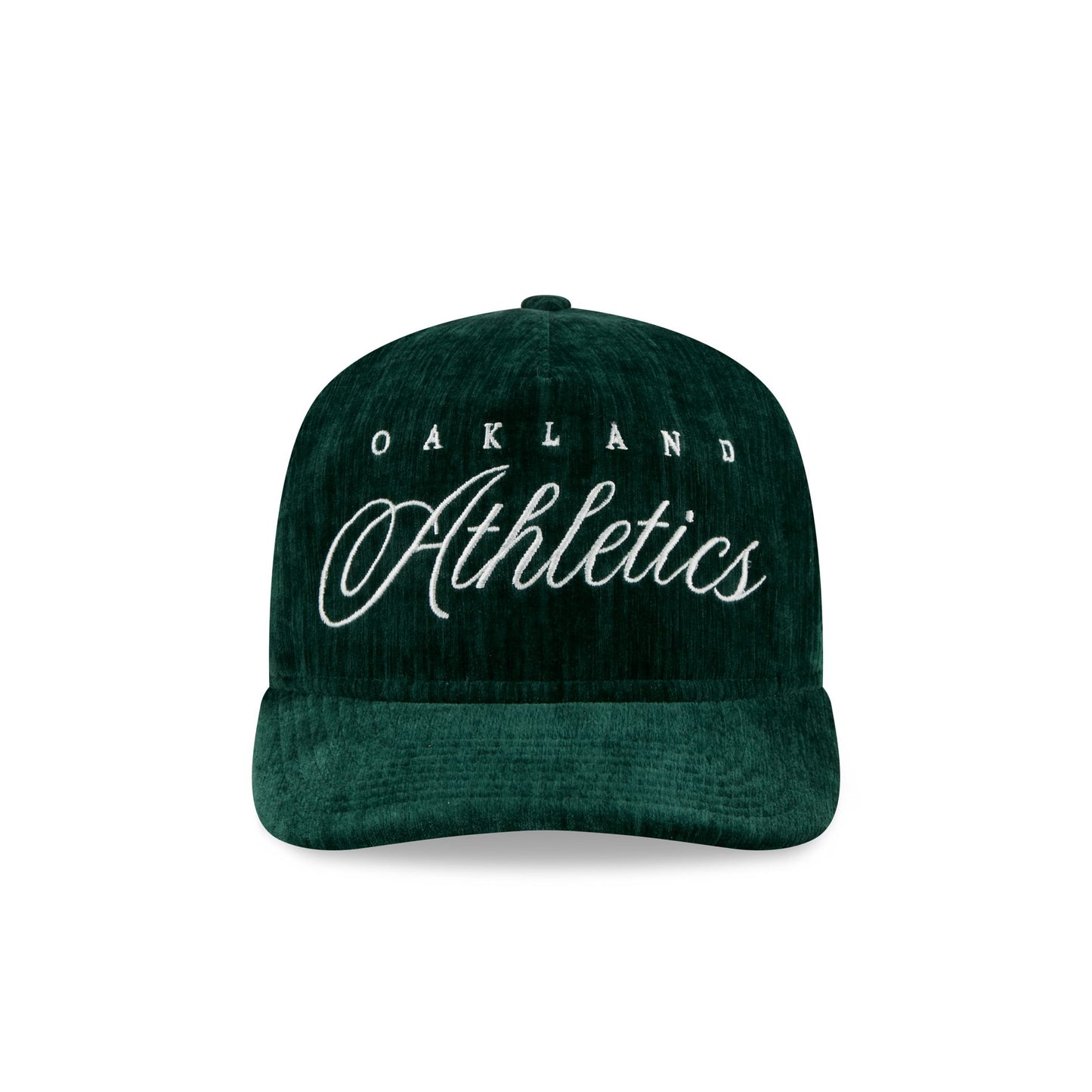 The Athletics Velvet Team Script 19TWENTY Adjustable Cap features an embroidered Athletics Cooperstown wordmark and logo at the front panels with an adjustable snapback closure at a pinstripe mesh rear and a gray undervisor.