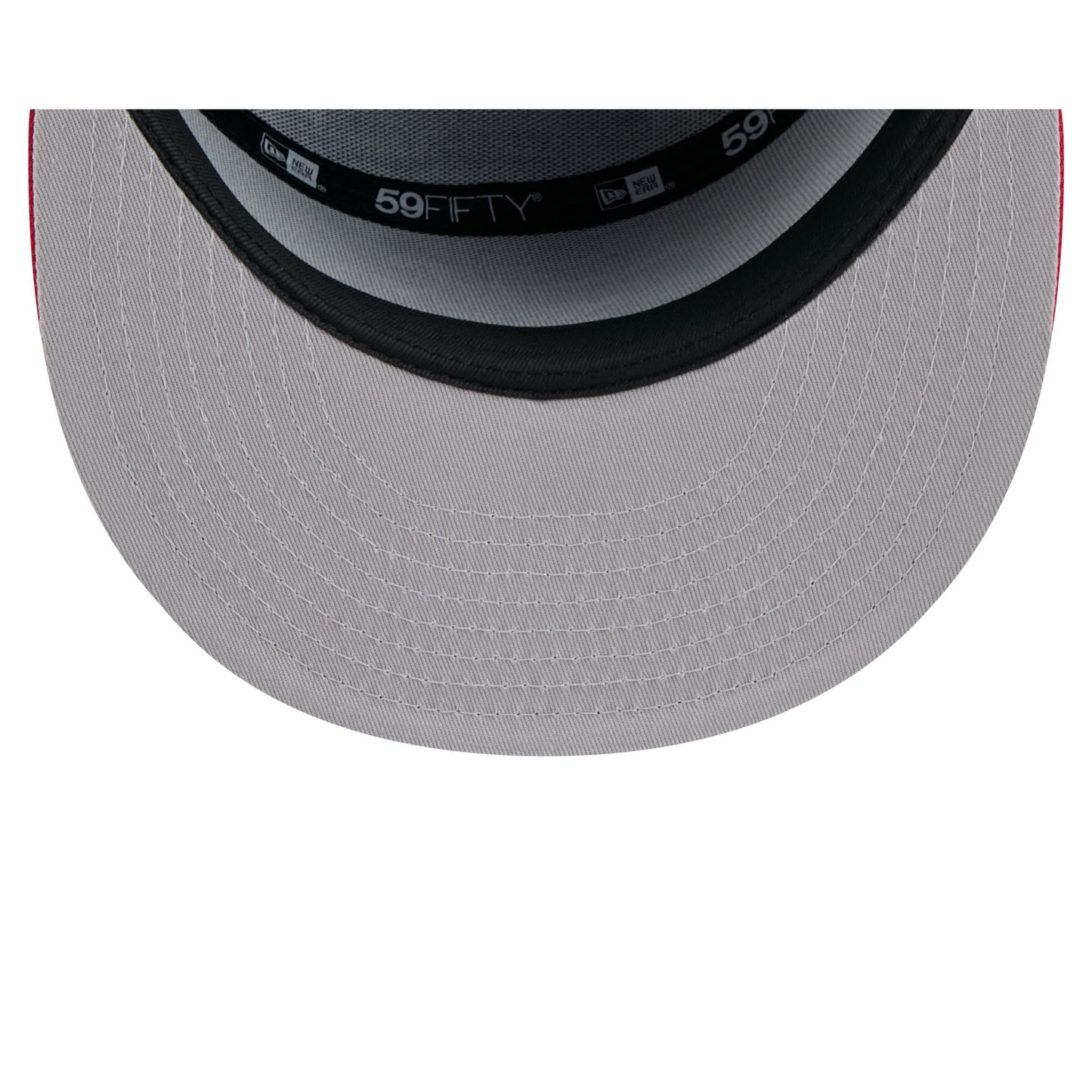 The Atlanta Braves 2025 All-Star Game Workout Split Panel 59FIFTY Fitted Cap features an embroidered Braves logo at the front panels against a split-crown construction with breathable mesh fabric at the side and rear panels. Additional details include stars at the top panel, a 2025 All-Star Game patch at the right-wear side, the MLB Batterman logo at the rear, and a gray undervisor.