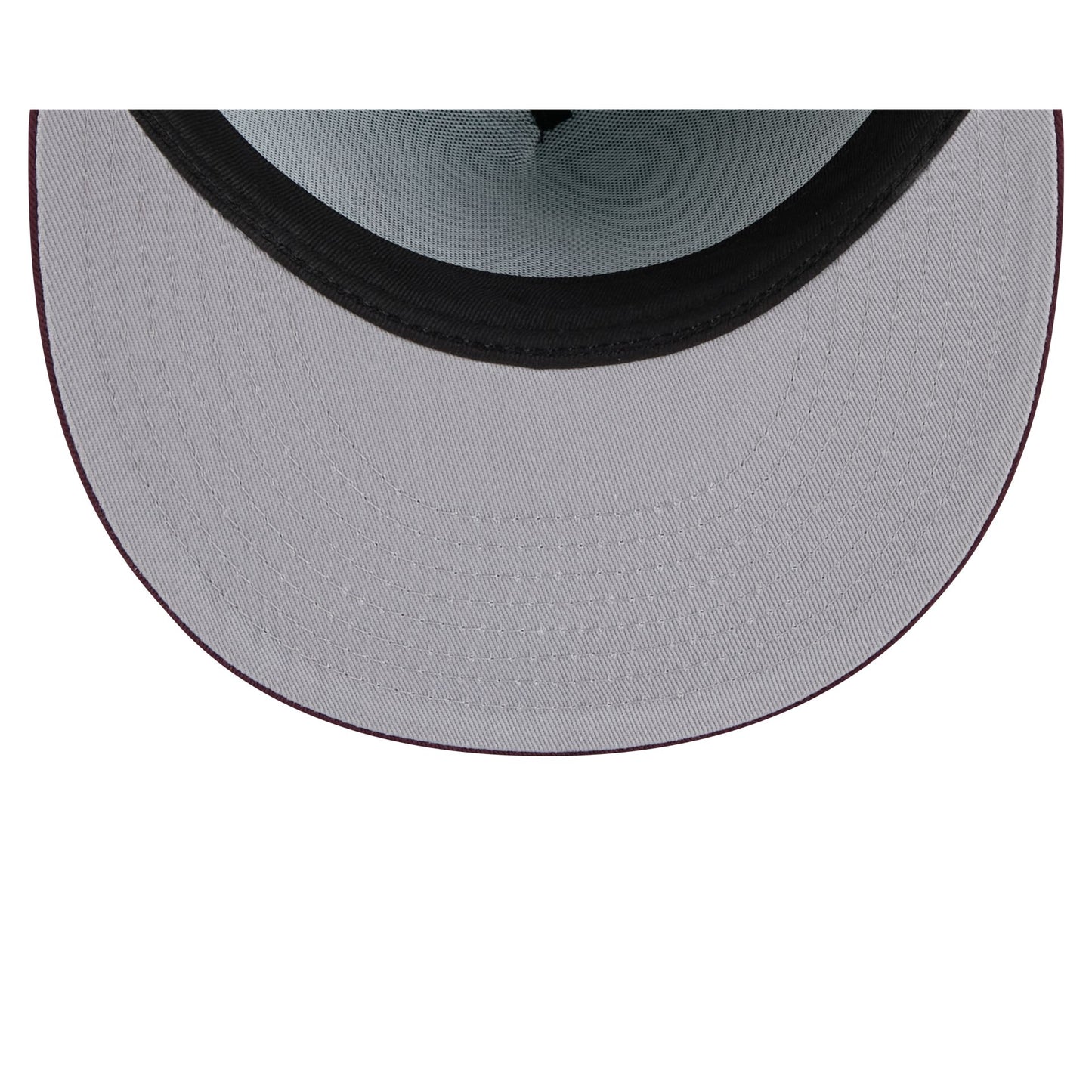 The Atlanta Braves Beach Kiss Blue 59FIFTY A-Frame Fitted Cap features an embroidered Braves logo at the front panels with a matching MLB Batterman logo at the rear. Additional details include a 40th Anniversary patch at the right-wear side and a gray undervisor.