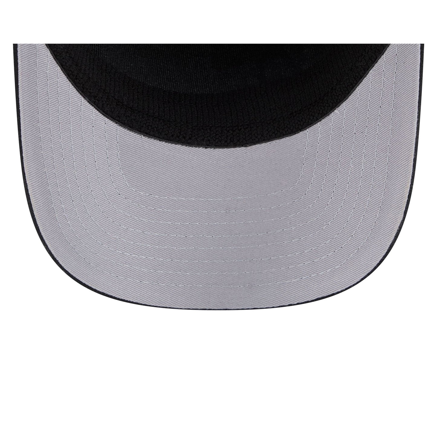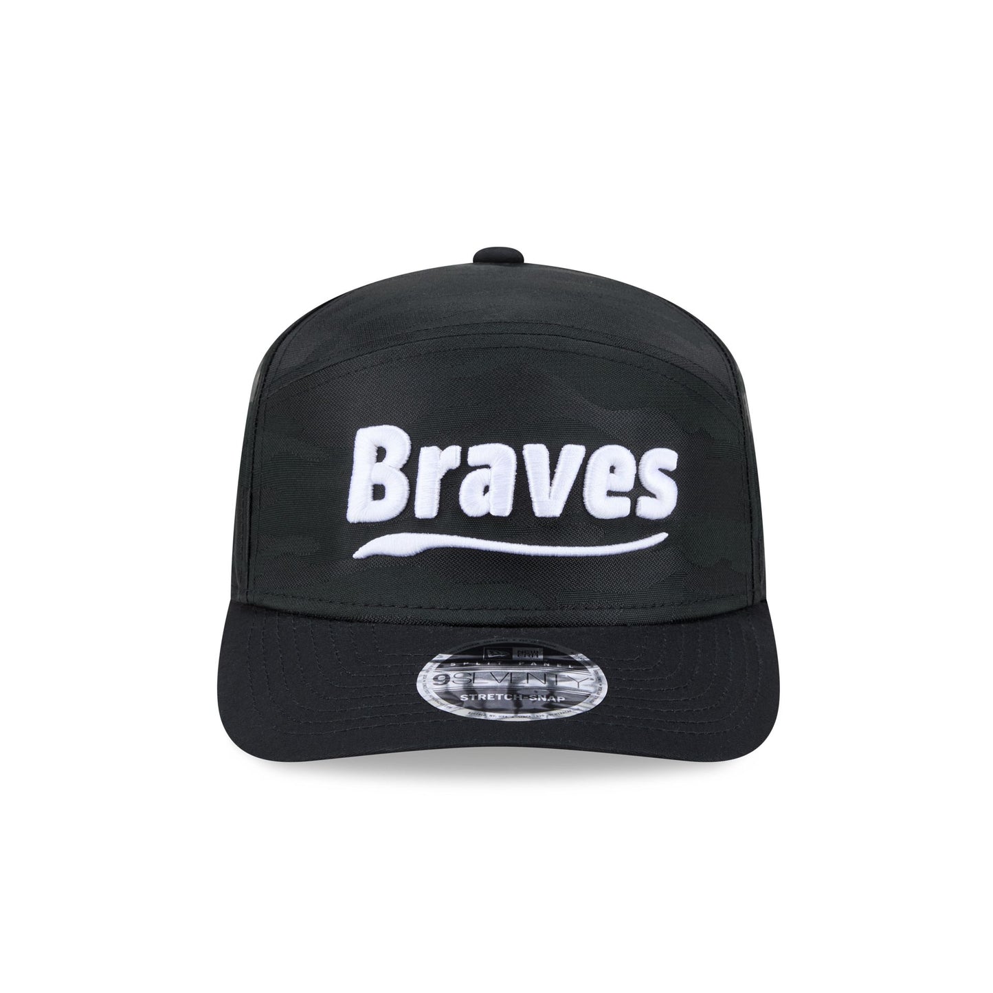 The Atlanta Braves Black Camo Split Panel 9SEVENTY Stretch-Snap features an embroidered Braves white wordmark at the front panel with a split crown construction and a team logo at the right-wear side. Additional details include a black camo print throughout, an adjustable stretch-snap closure at the rear, and a gray undervisor.
