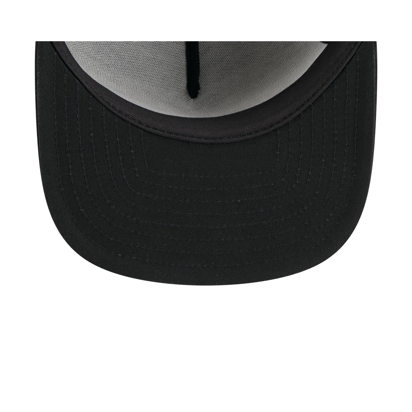 The Atlanta Braves Black Mesh 59FIFTY A-Frame Fitted Cap features an embroidered Braves logo at the front panels with a matching MLB Batterman logo at a patterned mesh rear.