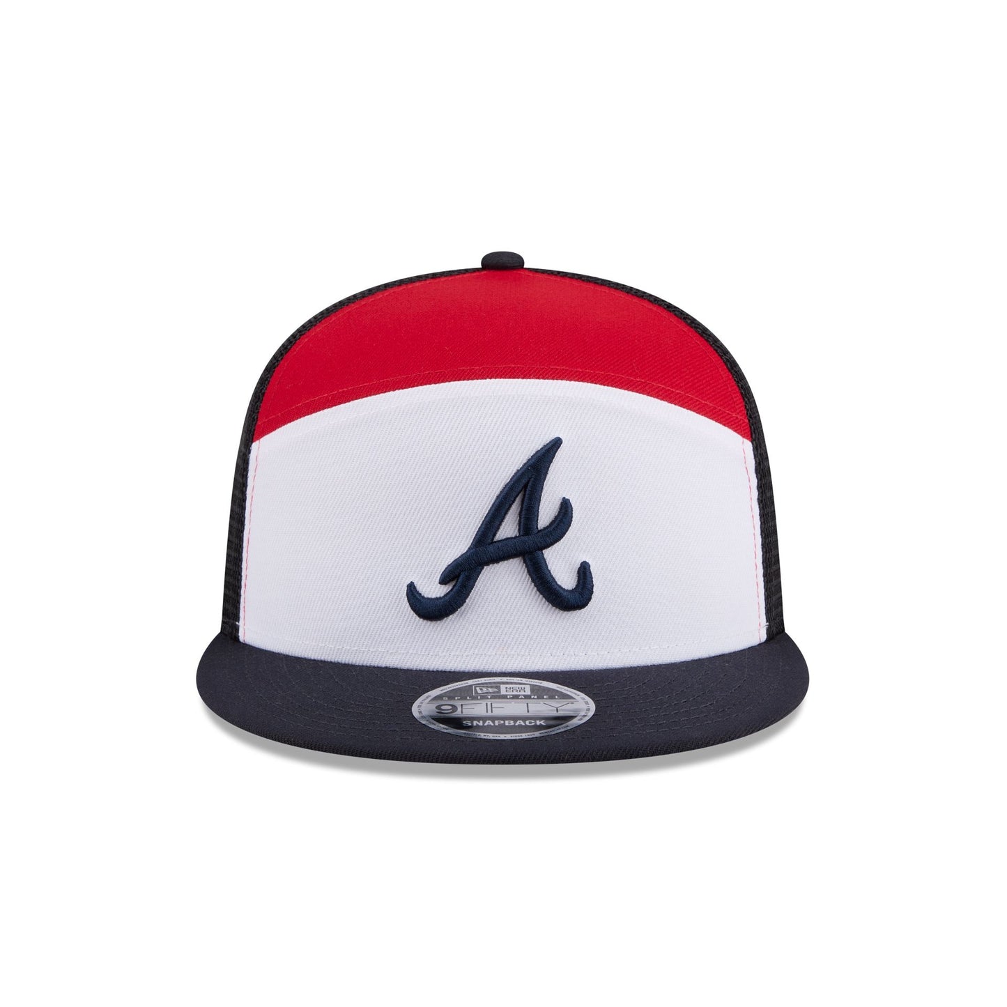 The Atlanta Braves Block Split Panel 9FIFTY Trucker features an embroidered Braves logo at the front panels with a split crown construction. Additional details include an adjustable snapback closure at a mesh rear and a gray undervisor.